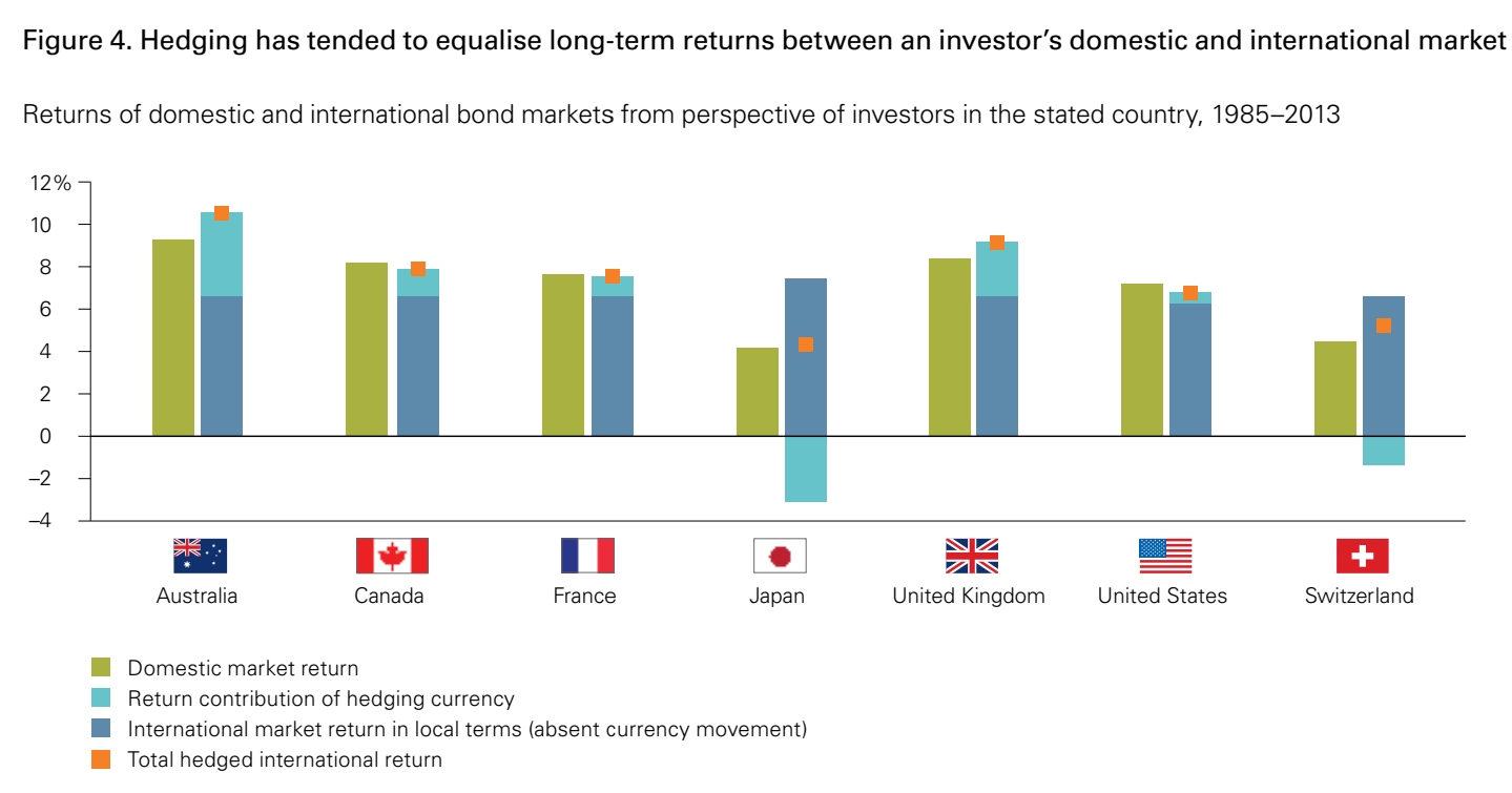Artikeln visar också empiriskt i ovanstående diagram att valutasäkring gör att internationella obligationer avkastar i linje med inhemska (orangea punkten = gröna stapeln).