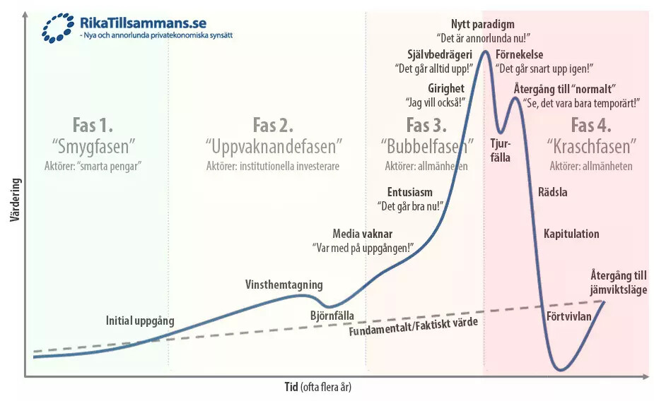 Jag spekulerar i att vi just nu - tidig maj 2022 - är någonstans i Fas 4 - kraschfasen. Jag upplever att vi är någonstans kring “rädsla” men att vi fortfarande inte har sett kapitulation eller förtvivlan. Upplever dock att vissa smarta pengar placerar sig redan nu (pågår en hel del insiderköp i börsbolagen).