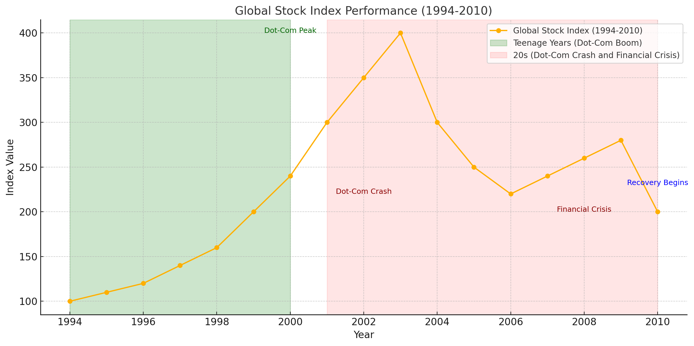 Här är grafen som visar ett globalt börsindex (exempelvis MSCI World Index) under åren 1994–2010. Den markerar viktiga perioder, som den kraftiga uppgången under dotcom-eran (1994–2000), nedgången från kraschen (2001–2002), finanskrisen 2008 och den gradvisa återhämtningen fram till 2010.