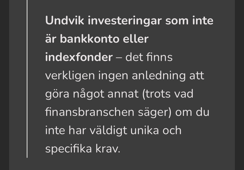 Undvik investeringar som inte är bankkonto eller indexfonder – det finns verkligen ingen anledning att göra något annat (trots vad finansbranschen säger) om du inte har väldigt unika och specifika krav.
