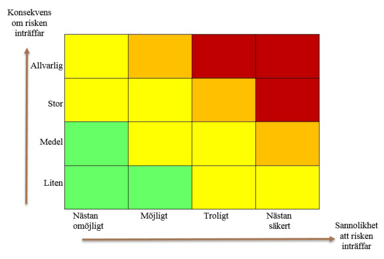 Jag jobbar med det som så sexigt kallas Risk Management inom industrin och precis som @JFB är inne på så definieras risk som sannolikt × konsekvens. Ofta brukar man plotta upp en Riskmatris med konsekvens på y-axeln och sannolikt på x-axeln. Den här modellen är hjälpsam när man tänker på riskreducerande åtgärder som innebär att risken kan sänkas genom att antingen sänka sannolikheten eller konsekvensen för en händelse.
