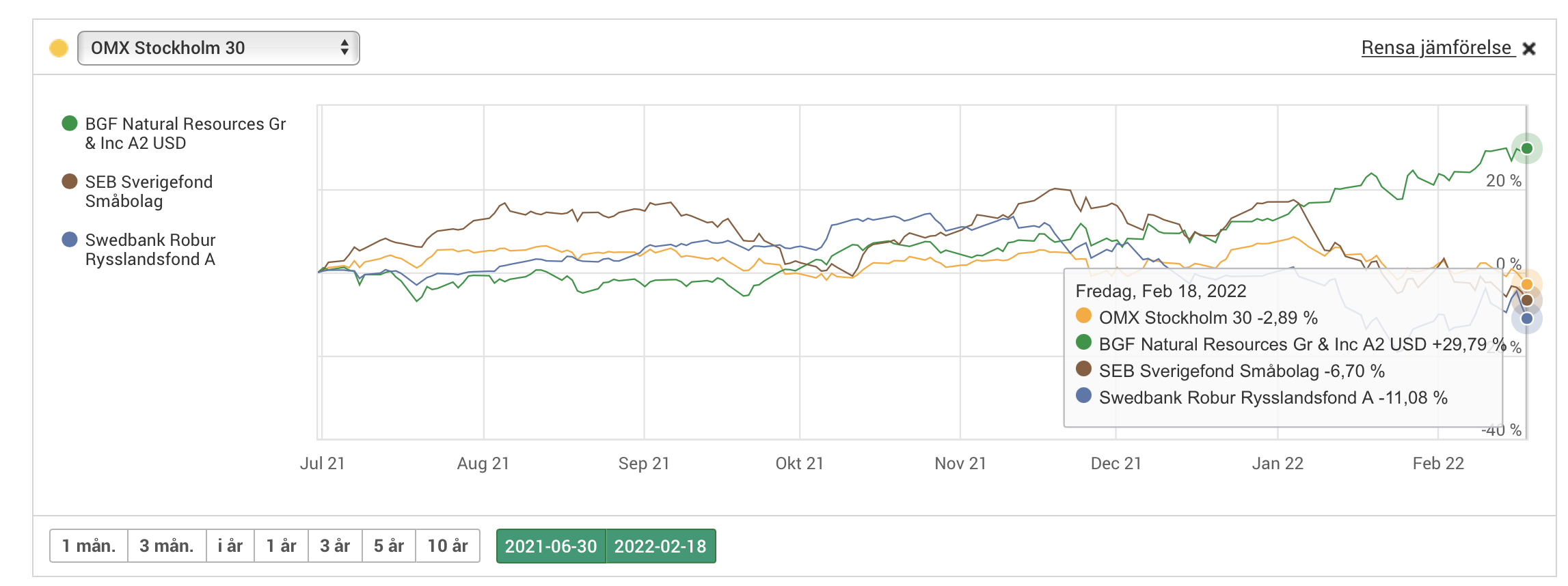 Men tittar vi på hela perioden från att Frida Bratt skrev artikeln till dagarna innan kriget i Ukraina, för några typiska fonder i marknaderna, ser man att fonderna ändå gick ganska OK. Snittutvecklingen var +4% mot OMXS30 c:a -3%. Snittet även under en sådan alldeles för lång period var alltså ändå bättre än OMXS30. Byten av fonder under denna långa period hade varit en bra idé men även utan var det ju ändå inte sämre än OMXS30. Rysslandfonderna var även på stark uppgång precis innan kriget.