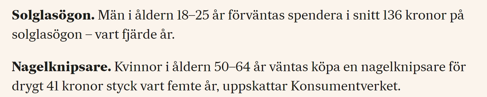 Jag tycker de har gått in på en detaljnivå som är helt vansinnig, och innebär totalt värdelös information. Vissa människor lägger mycket pengar på hygienprodukter, andra lite mindre. Hur många det går åt av en viss sak känns rätt irrelevant. Och att en man ska köpa solglasögon för 136 kr… på macken? Håller de så länge då? Vissa kommer ju slarva bort dem genom att lägga dem på Volvons tak.
