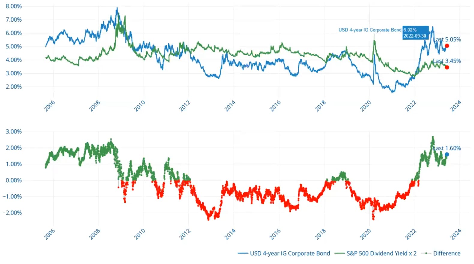 Det som Daniel gör är att jämföra den dubbla utdelningen från S&P500-företag (=proxy för aktiemarknaden) med en räntan på 4-åriga investmentgrade företagsobligationer. Tolkningen av grafen är inte att göra en förutsägelse kring vad avkastningen kommer vara framgent, utan att ge ett perspektiv på hur man kan jämföra vad som ter sig vara prisvärt ur ett perspektiv just nu.