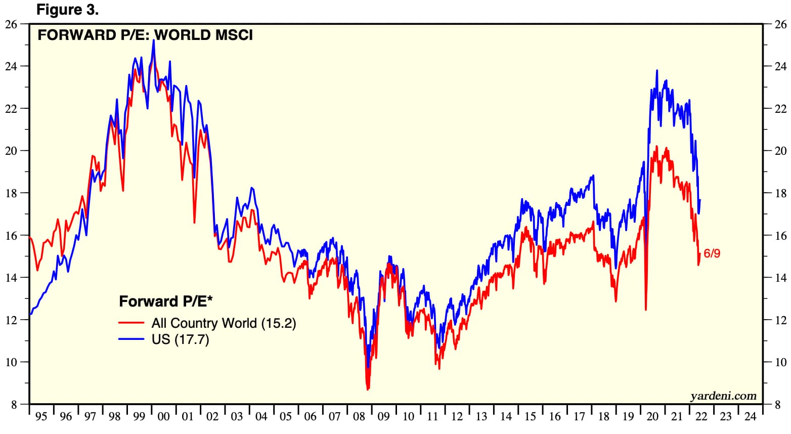 De flesta globalfonder följer ju MSCI World, så då kan vi titta på Yardeni Researchs jämförelse mellan US och MSCI World [https://www.yardeni.com/pub/mscipe.pdf].