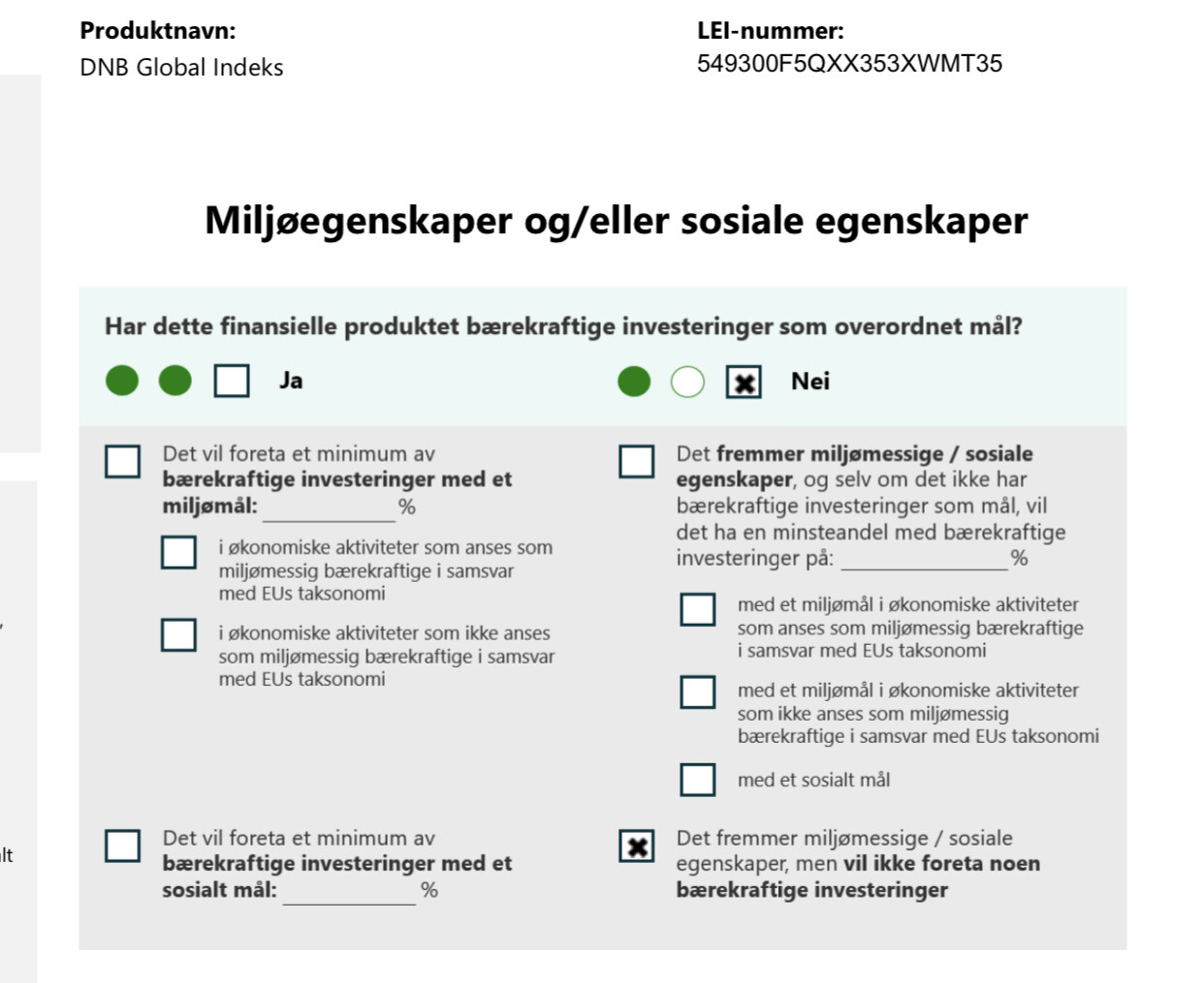Enligt DNB Global Indeks Faktablad från 2024-01-31 så är fonden en artikel 8 fond. Men oljebolagen är kvar så vet inte vad man ska tro.