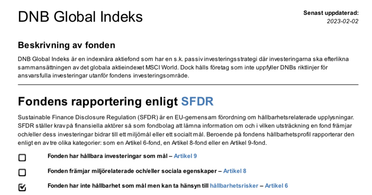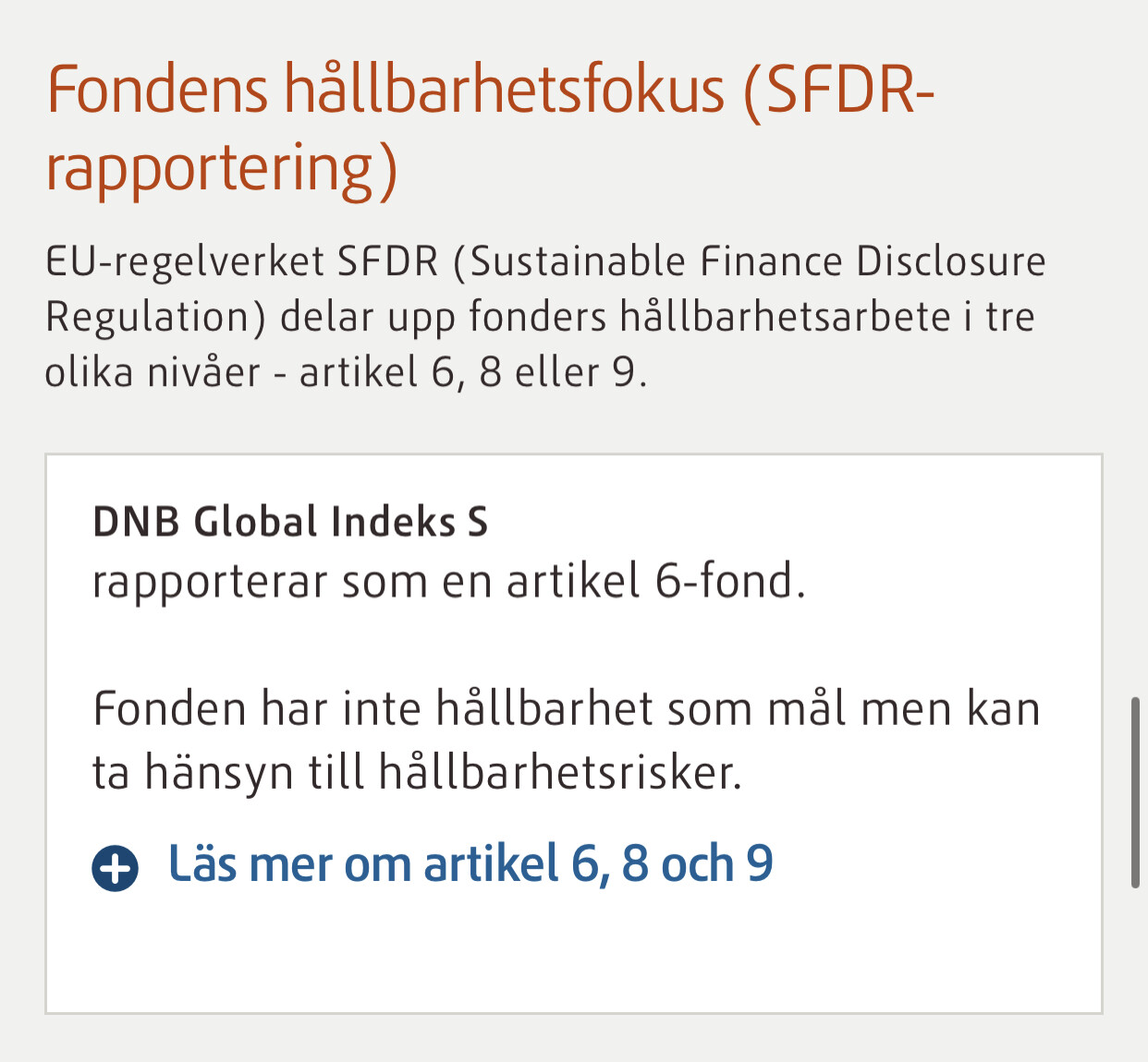 Hmm fast när jag läser på Avanza verkar även DNB global vara en artikel 8 fond? Isåfall borde väl Skandia vara bäst eller står det det fel på Avanza bara?