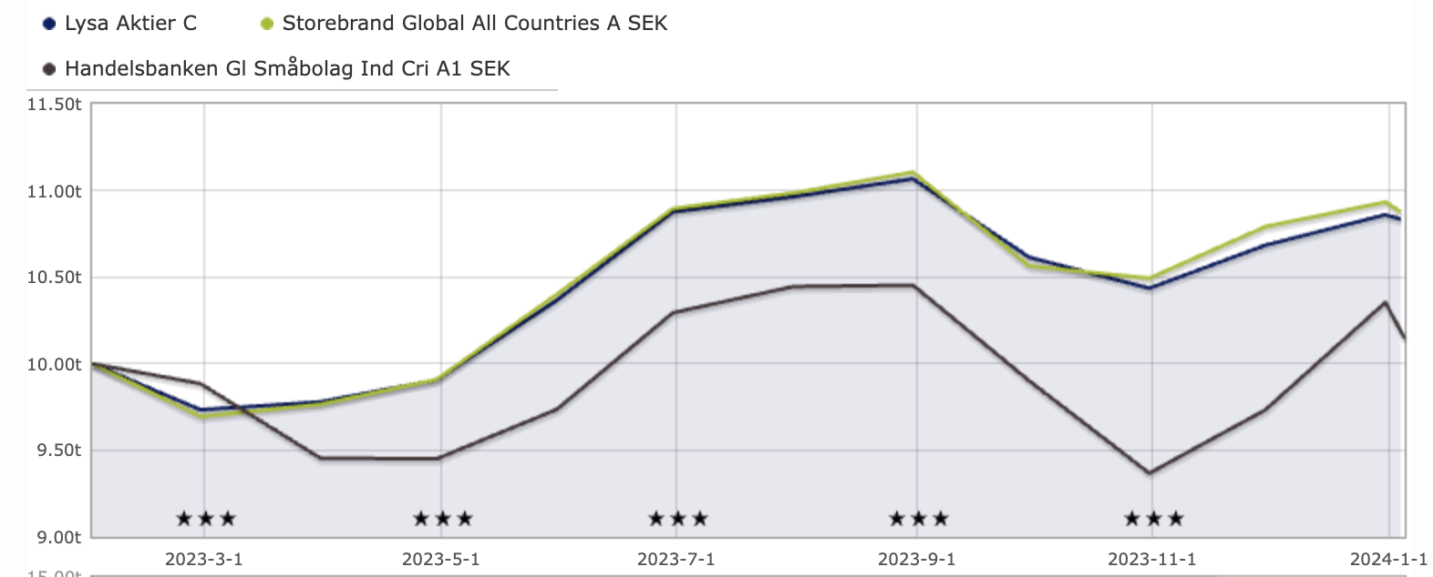 Om vi tittar på avkastningen av Lysa Breds globala del vs Storebrand Global All Countries vs den mest populära globala småbolagsfonden, ser det ut så här: