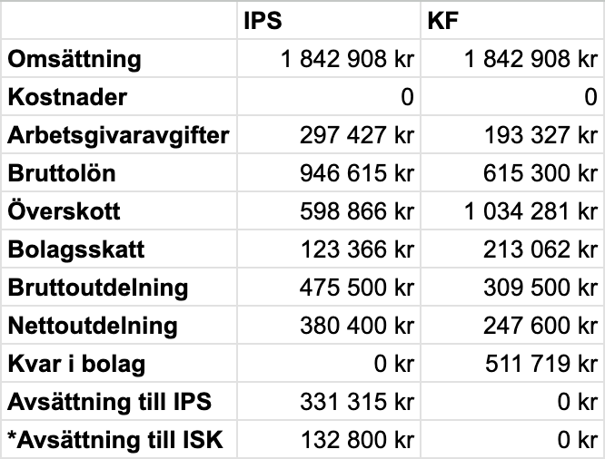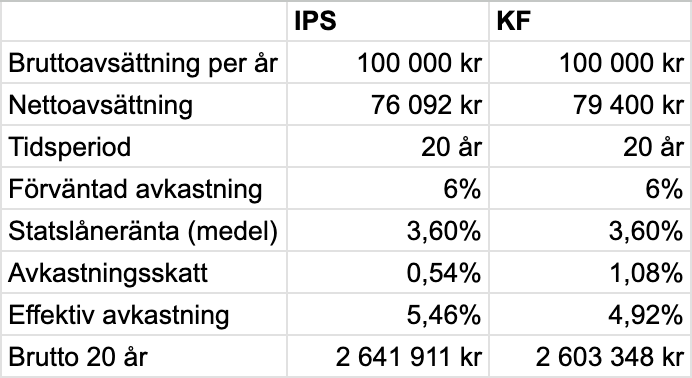 Ungefär samma resultat, men här har vi inte räknat någon form av avkastning eller dragit av avgifter, där fördel hamnar på IPS mot en kapitalförsäkring.