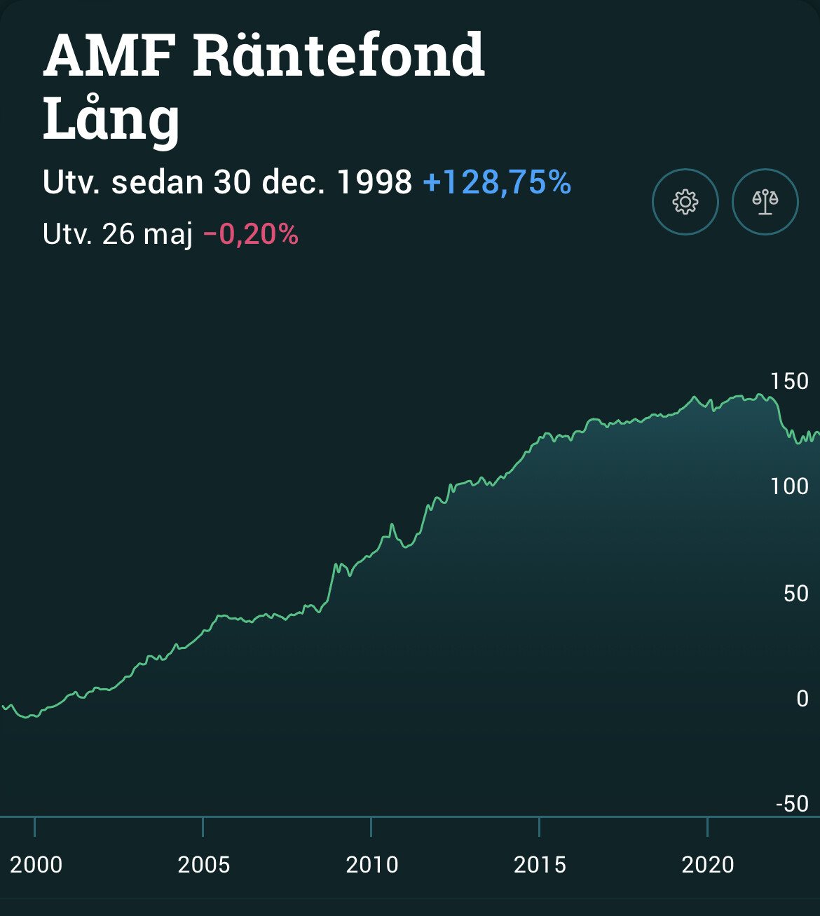 Här ser vi att fonden steg i värde efter finanskrisen då räntorna sänktes till noll och minus. Snabbspola till kriget så ser du att fonden då tappade i värde som en konsekvens av att styrräntan höjdes.