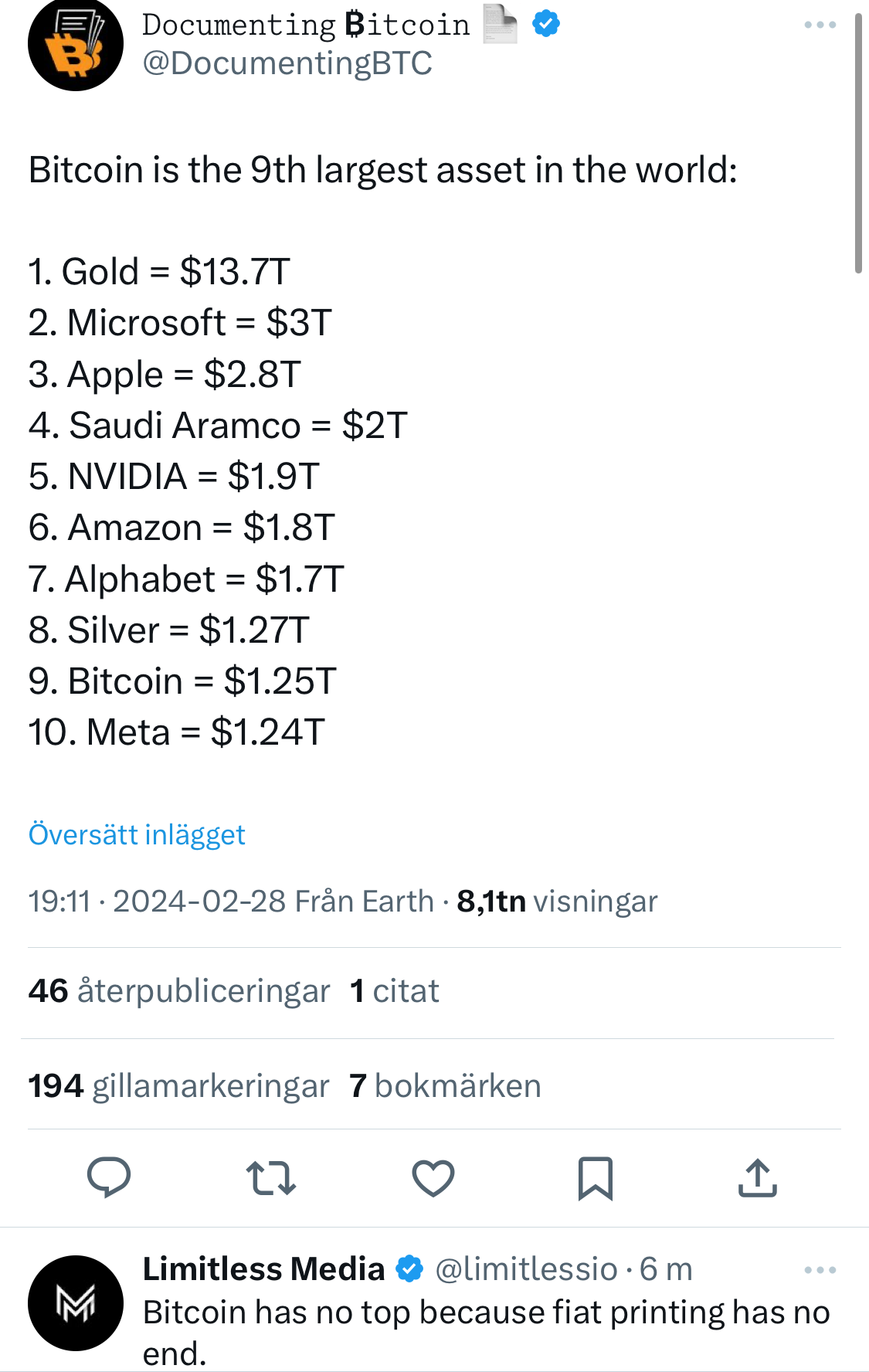 Dagliga efterfrågan från de nya ETF:erna är ca 10x högre än utbudet från miners just nu. Håller det i sig till halveringen så kommer skillnaden att bli ca 20x. Pga supply crunch uppstår en multipel på varje Fiat som åker in i Bitcoin (vissa tror denna är så hög som 100x, vilket jag personligen tror är alltför optimistiskt).