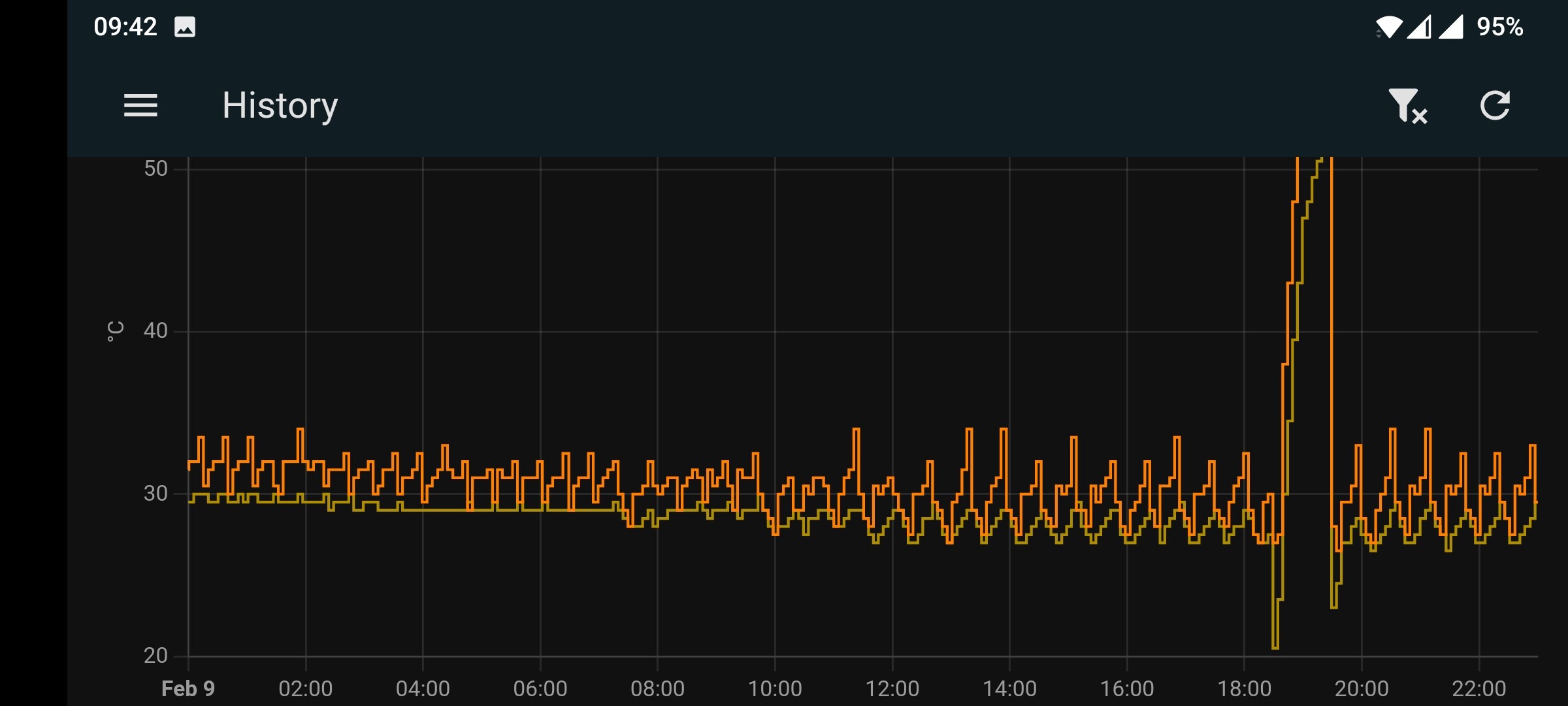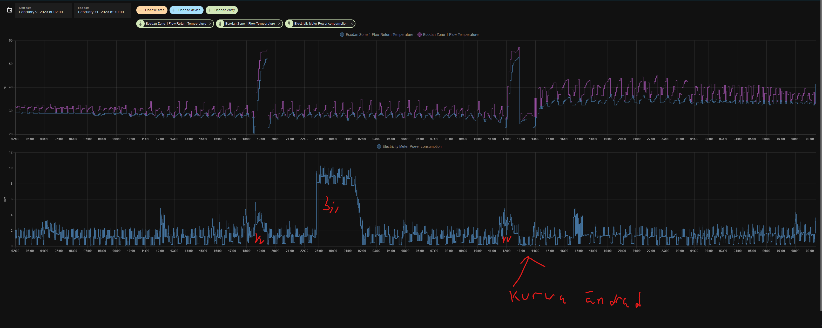 Jag höjde kurvan igår och sänkte pumhastigheten vid 13 tiden. Den gick lite jämnare där ett tag ser det ut som? Men pendlar fortfarande mycket. Och det blev runt 22-23 grader inomhus så vi kunde knappt sova Nu är det dessutom 8 plusgrader utomhus så svårt att mäta nu när ute temperaturen svajjar så mycket.