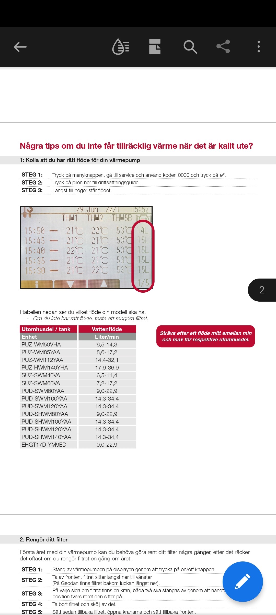 Något jag tror är knas är flödet. Cirkulationspumpen står på maxfart men flödet är ändå bara 9l/s. Enligt manualen bör det vara minst 10.8 l/s(om det nu är samma flöde som menas). Sänker jag hastigheten så det går under 5l/s så utlöses larm om lågt flöde. Jag har tömt filtret.