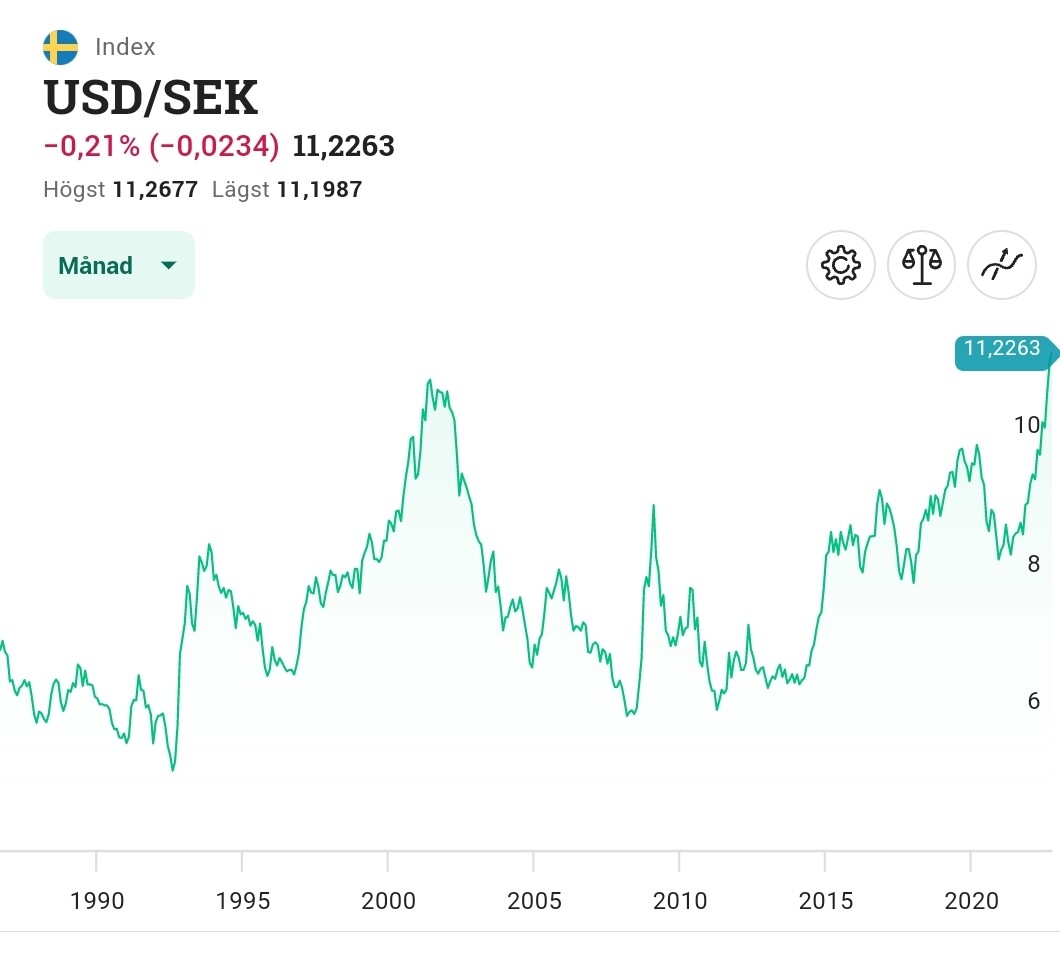 Kronan stärks och kronan sjunker över tid. I nästan 10 år, fram till 2014 var kronan i förhållande stark förutom under några spikar.