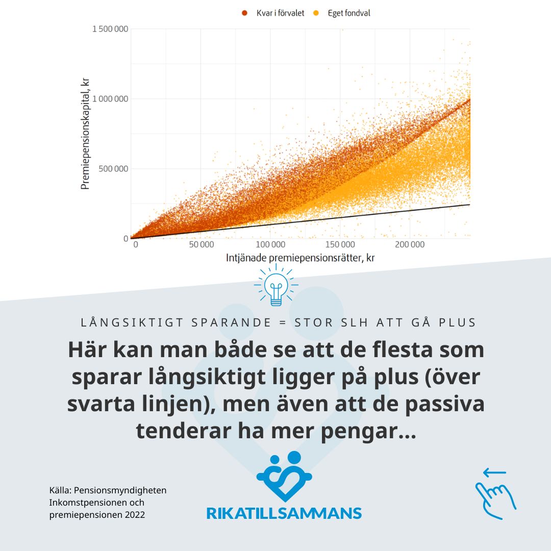 Sista grafen visar att ju längre tid man sparar, desto större sannolikhet att man har går plus (=över svarta linjen). Gissa vem som ter sig ha mest pensionskapital?