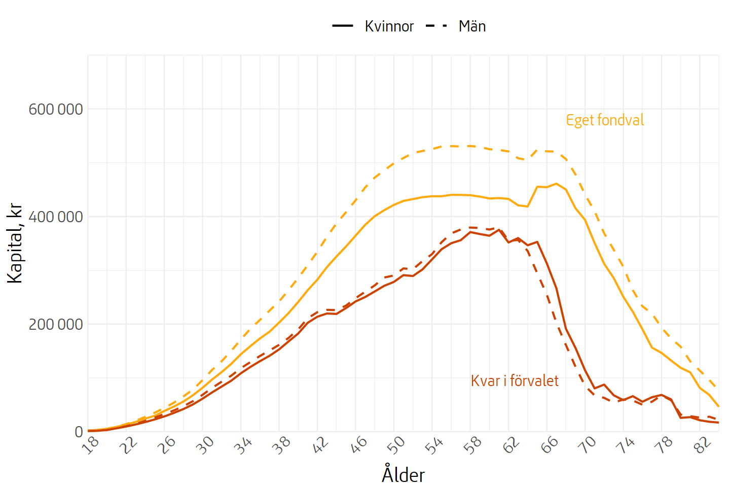 Får vi se att för en 42-åring (medelåldern i Sverige), motsvarar denna skillnad hela 40 procentenheter över 25 år. Om Anna får 1.000.000 SEK kommer Anders att få 600.000 SEK. ![]()