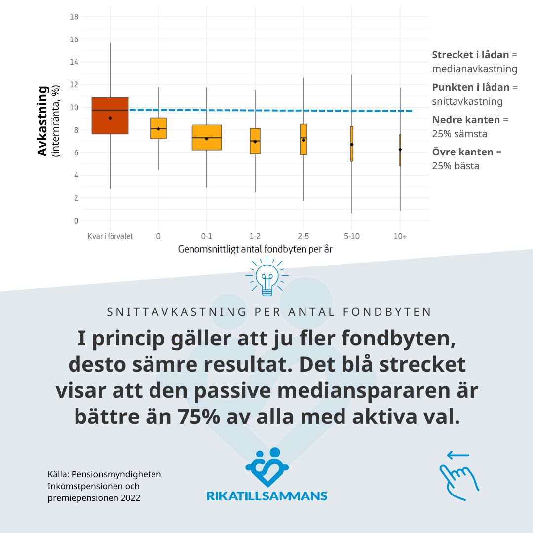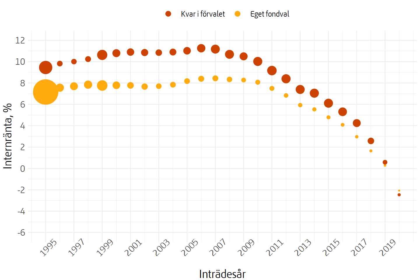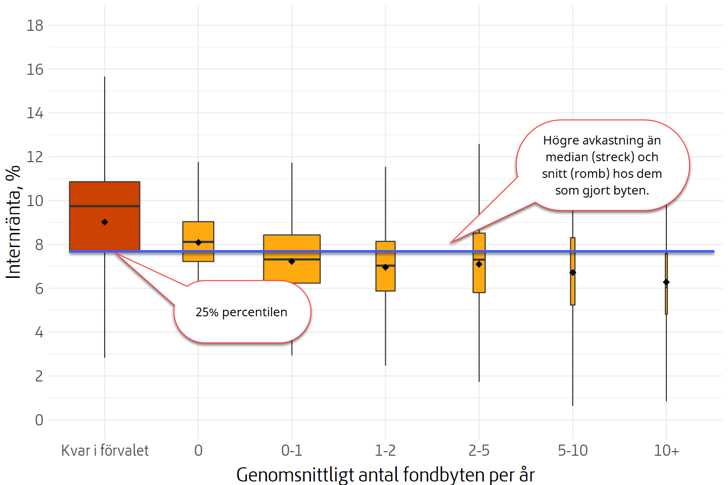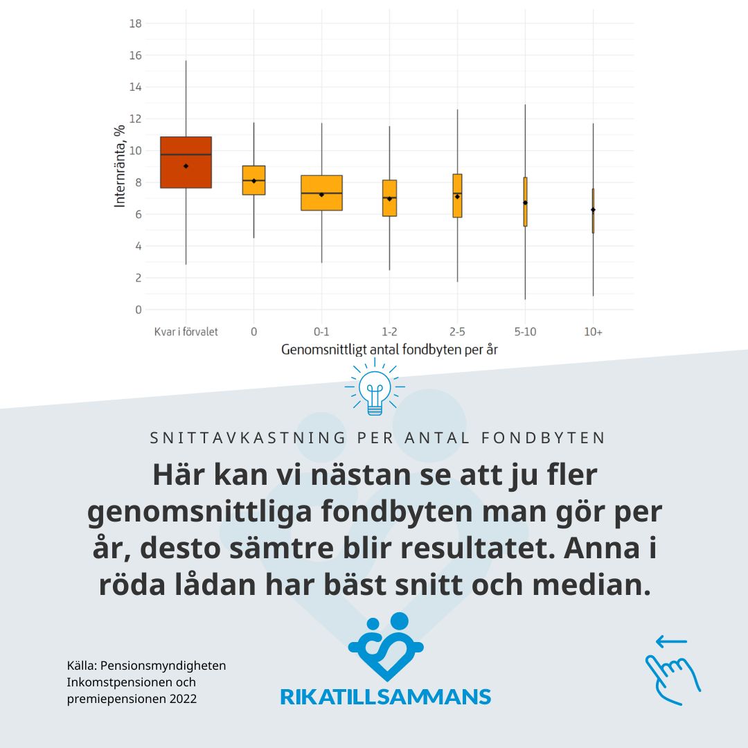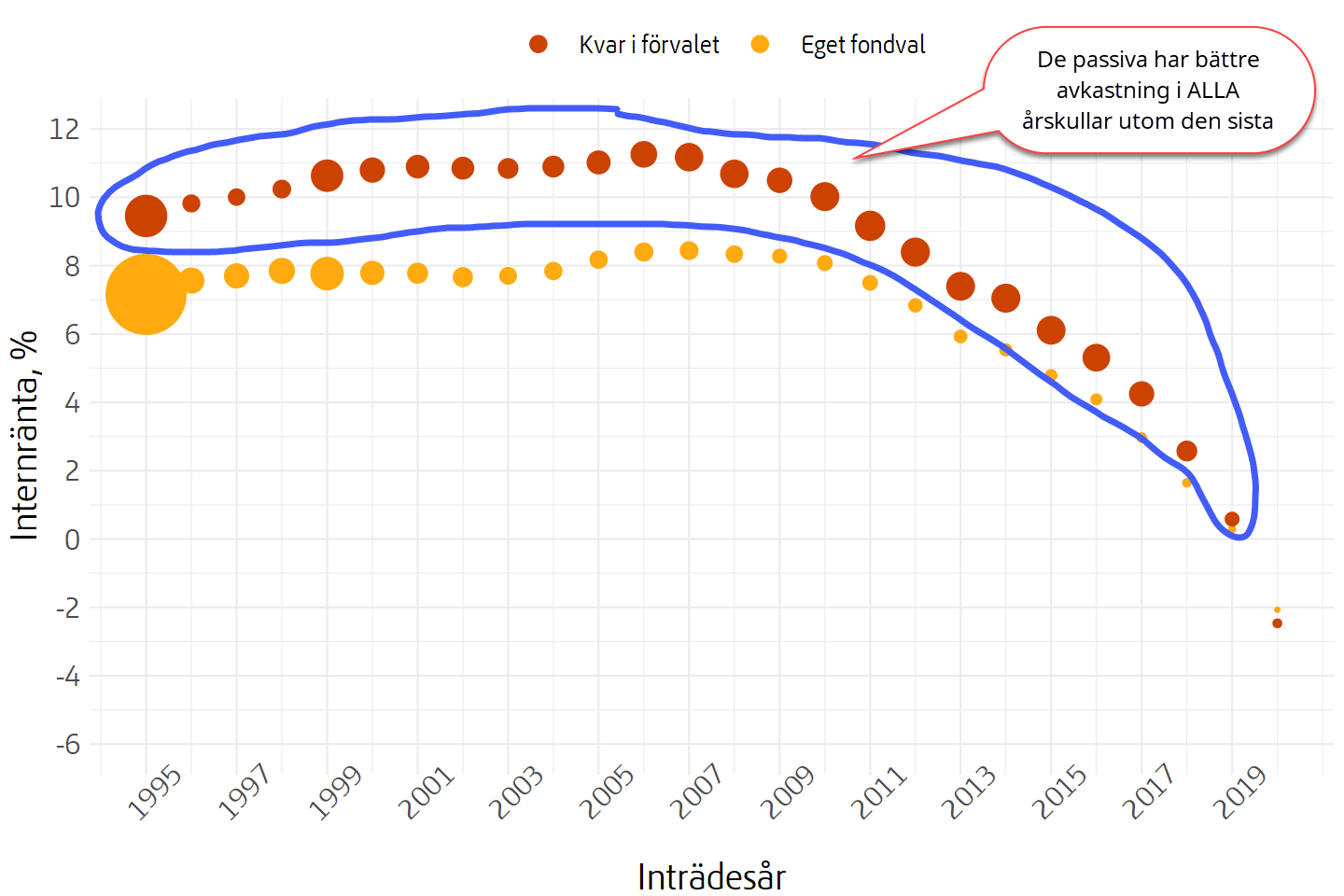 I nästa graf kan du se att trenden är samma oavsett när man kom in i pensionssystemet. I den näst sista grafen kan vi till och med se avkastningen i förhållande till antal fondbyten. Föga förvånande har Anna och de andra passiva en högre avkastning. Återigen, den aktivt passive vinner över den aktiva. Det är nästan att ju mer aktiv, desto sämre resultat. Vem kunde tro det? ![]()