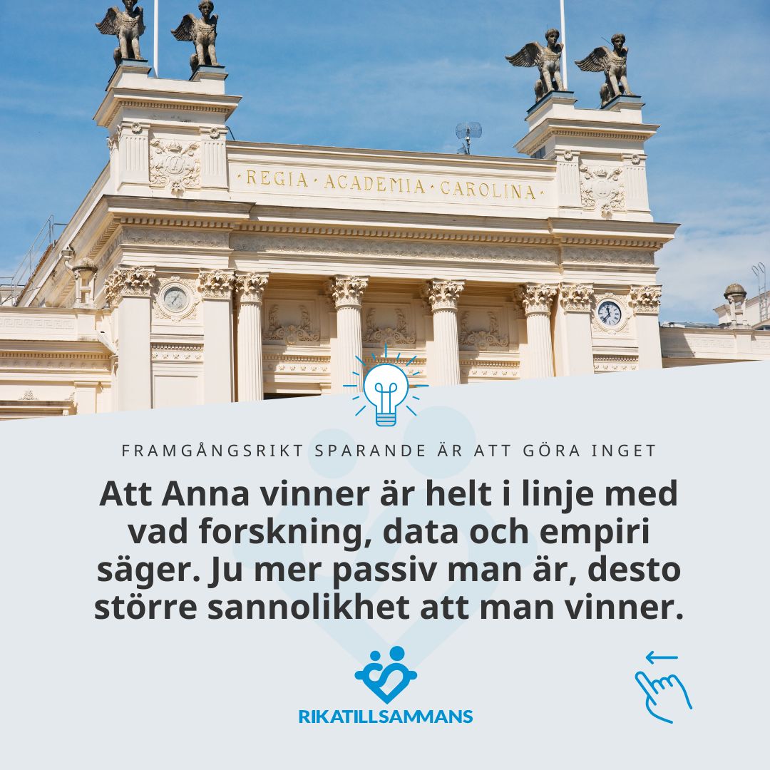 Att Anna vinner är helt i linje med vad forskning, data och empiri säger. Ju mer passiv man är, desto större sannolikhet att man vinner. Så grattis till dig som är aktivt passiv, lat, oengagerade och oinloggad. ![]()