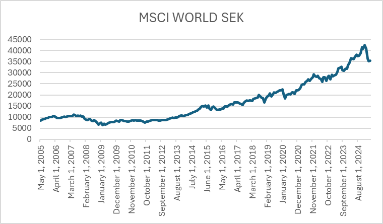 Sammanfattat tänker jag att valutarisken för en svensk investerare är reell på kort sikt – särskilt vid belåning eller oflexibla FIRE-uttag – men tappar snabbt betydelse över längre tidshorisonter. Som @JFB skriver har man ju även oftast andra inkomster i SEK. Är man ändå orolig kan man överväga att inkludera större andel svenska räntefonder och/eller home bias som ett enkelt, rationellt skydd.