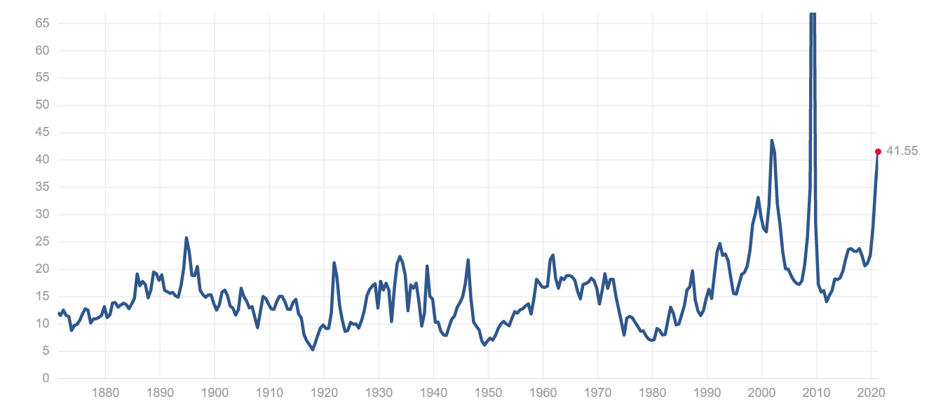 För att ge ytterligare perspektiv så kommer här en historisk graf på P/E sen 1800-talet