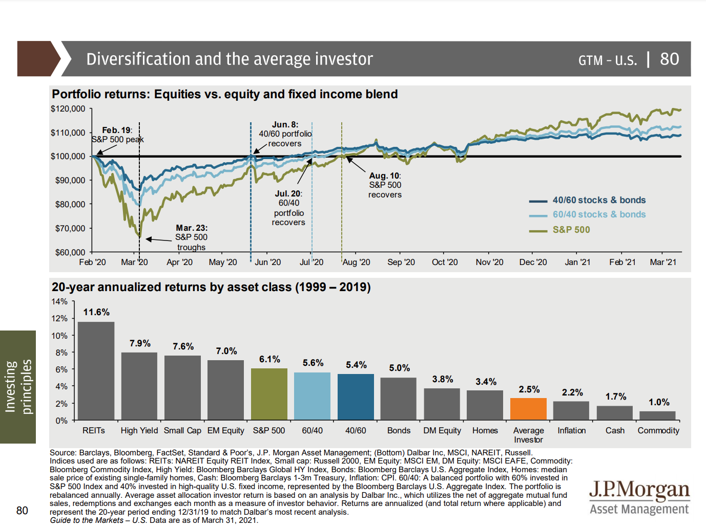 Från JP Morgans “Guide to markets” per 31 mars 2021. Visar återigen på tesen att den genomsnittlige investerare underpresterar mot både index och uppenbarligen även en 60/40-potfölj.
