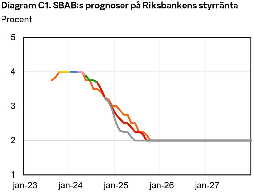 Även om det delvis kan ses som lite skryt så är det intressant hur SBAB denna gång har en bilaga om hur olika aktörers prognoser över Riksbankens styrränta har ändrat sig sedan förra hösten (de gråa linjerna representerar de senaste prognoserna):