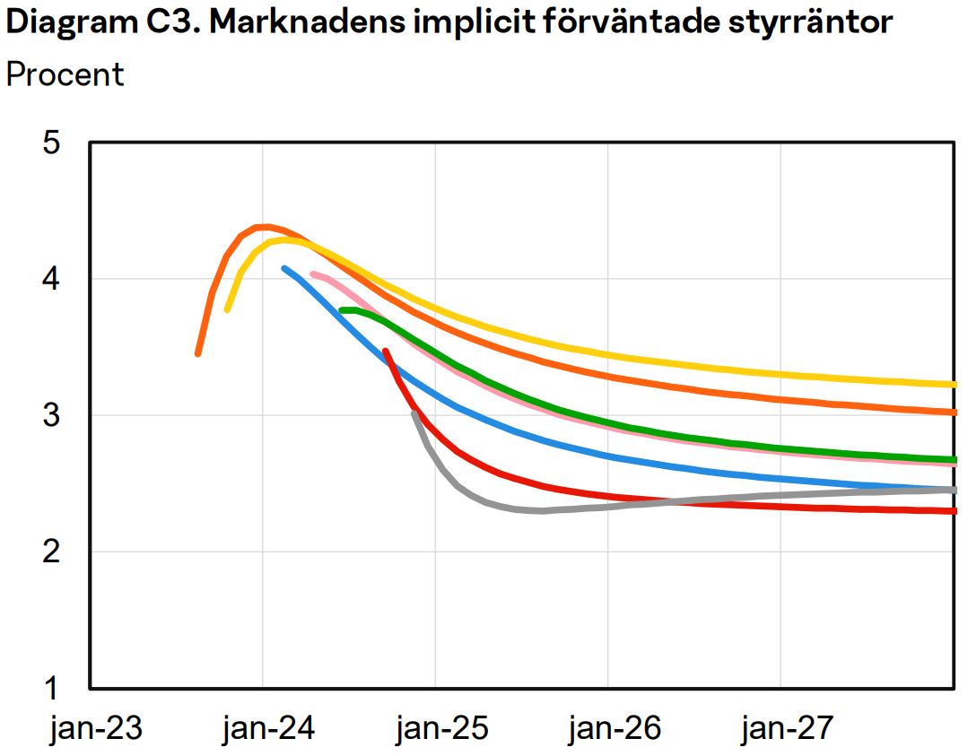 Mitt exempel från SBAB tycker jag är intressant på flera sätt. Till exempel att det skulle kunna ha funnits påverkansambitioner när RB inledningsvis höll fast vid en högre räntabana, att marknaden inte behöver vara bättre på prognoser än enskilda aktörer, och att marknadens senaste prognoser börjar peka på en ränteuppgång efter utplaningen 2025.
