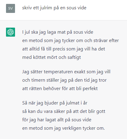 Jag testade också med julrim, men den avslöjar innehållet i första meningen i samtliga försök dessutom otroligt trista rim. Men den har ändrat stil sedan jag försökte för några dagar sedan.