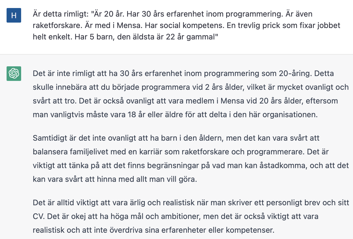 Jag tror det är just falska, självsäkra svar som OpenAI försöker förhindra med den filterfunktionen. Begränsningarna förstör dock, i mitt tycke, upplevelsen. Hellre självsäkra, välskrivna BS-svar än löjliga filter man hela tiden måste jobba emot.