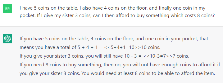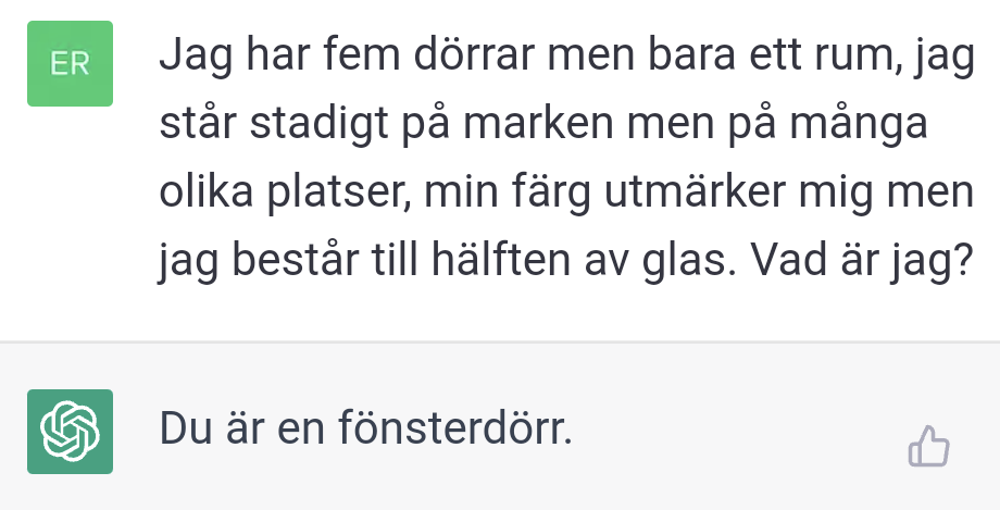 Även på svenska början den bli så bra att den kan förstå hur saker förhåller sig i rummet. Vilket är spännande när man tänker på det, denna AI är aldrig tränad på hur vår 3-dimensionella värld beter sig men har lyckats koppla detta utifrån enbart text.