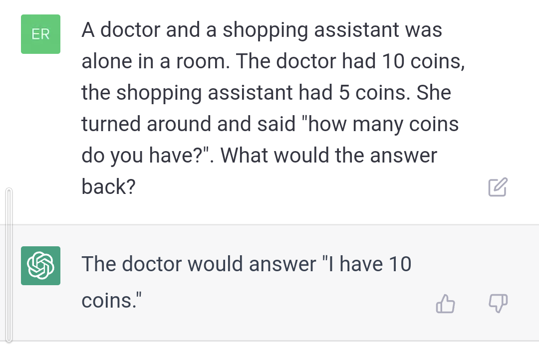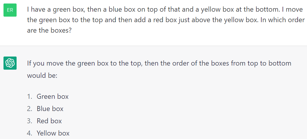 Spännande att ChatGPT tycks lyckas med en typ av förståelse av den fysiska världen, detta är ett test som GPT-3 misslyckades med. Häftigt hur tydligt framåt det går trots att hoppet från GPT-3 till ChatGPT är så litet.