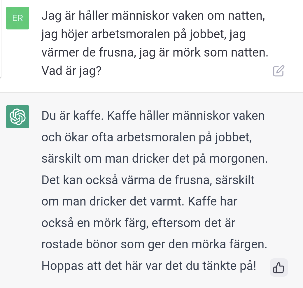 Här sitter jag igen och testar hur bra den är. Klarar hyfsat bra av lite olika gåtor som jag testat på svenska.