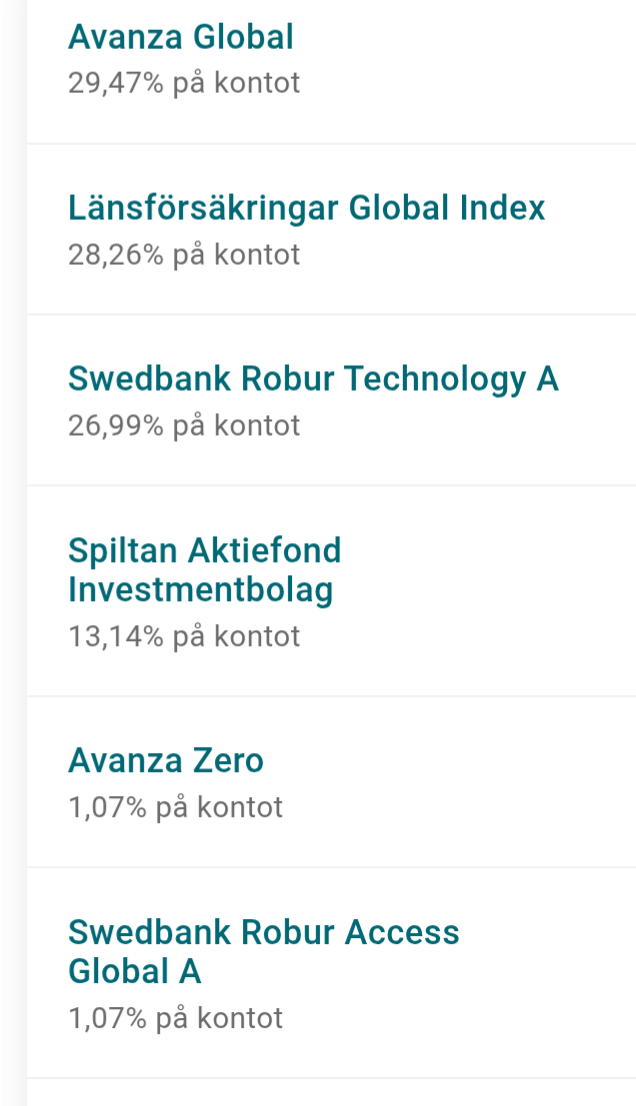 Behöver lite tips här, det känns som jag har för många fonder. Borde nog ha två mindre än vad jag har. Vilka skulle ni ta bort? Ignorera procenten under.