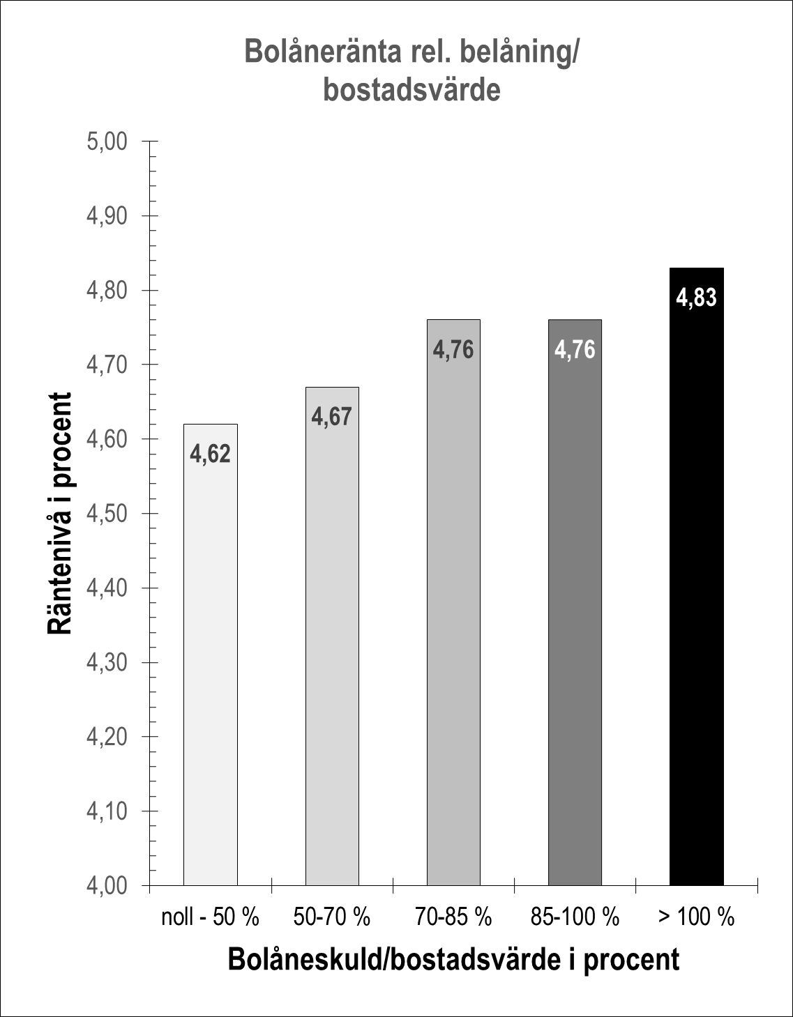 . Tyvärr visar inte SCB data för “noll-50 %” trots att de har dem. Det skiljer 14 punkter mellan 100 % belåning och noll-50. Om belåningen/värde utgör 1/10-del tycker jag att ränterabatten borde vara större.I Sverige är det dubbla säkerheter för bolån, både bostaden och låntagaren är pantsatt. Verkar konstigt att stirra sig blind på endast en del av säkerheten.
