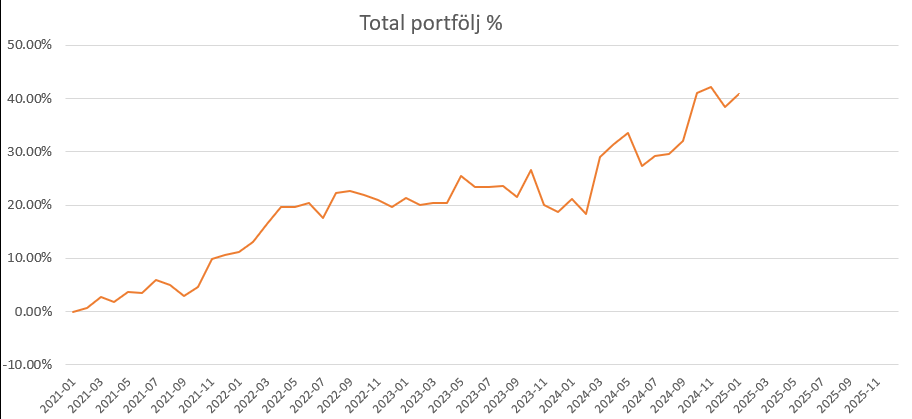 Utvecklingen av Aktiegubbens totala portfölj sedan januari 2021 efter att jag har plockat ut räntor och aktieutdelningar som jag lever gott på varje år. I portföljen finns inga indexfonder utan endast utdelningsaktier, korta räntefonder och ädelmetaller.