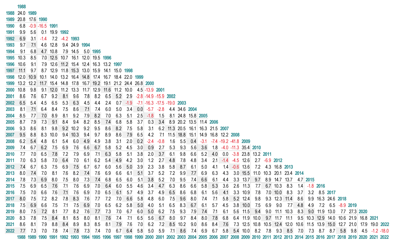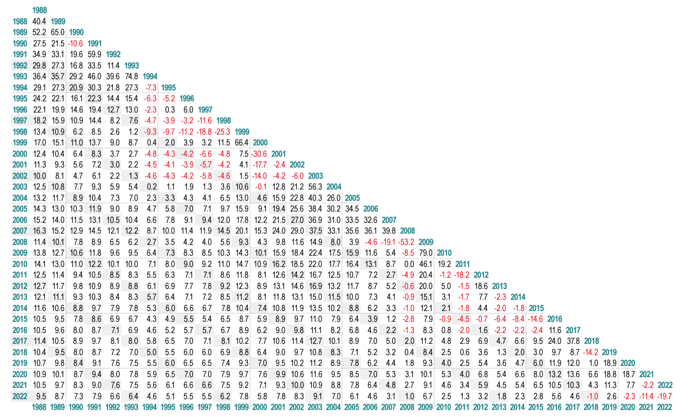 Realistisk utslaget på 10 år så är 7-10% rimligt, i genomsnitt (exponentiellt genomsnitt).