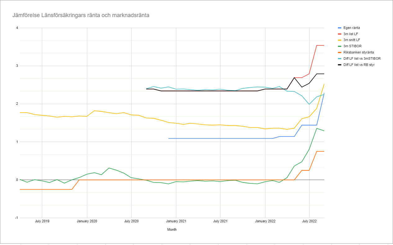 Har Länsförsäkringar (LF) rörligt/3m 2.29% (stack nyligen från 1.44%), med belåningsgrad ~60% och ränterabatten löper ut vid årsskiftet.