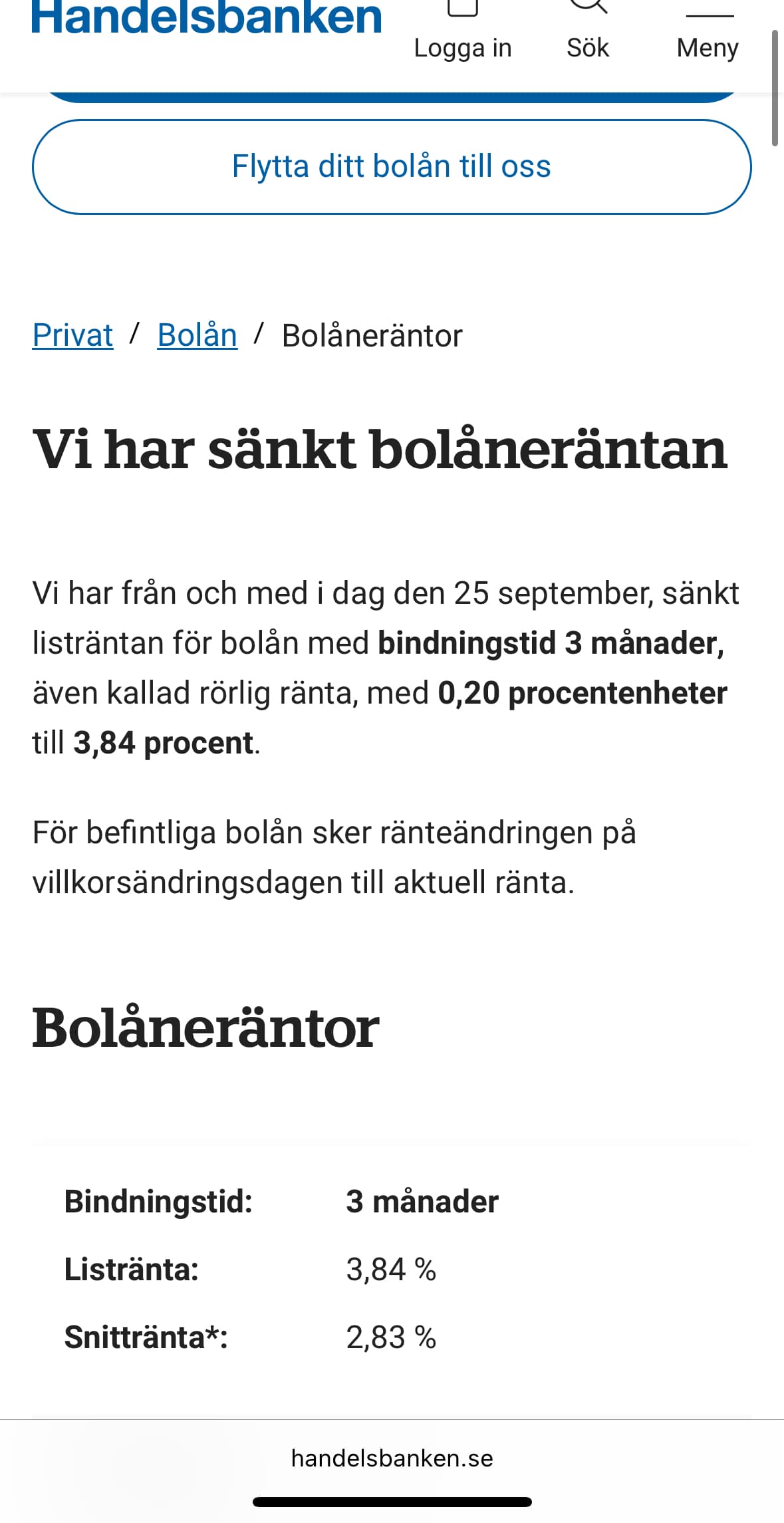 Själv har 2.45% rörligt hos SHB så kommer bli 2.25% i 1a Oktober som den nuvarande 3månader löper ut. Kostigt som SHB bara sönkte med 20 punkter den här gången ![]()