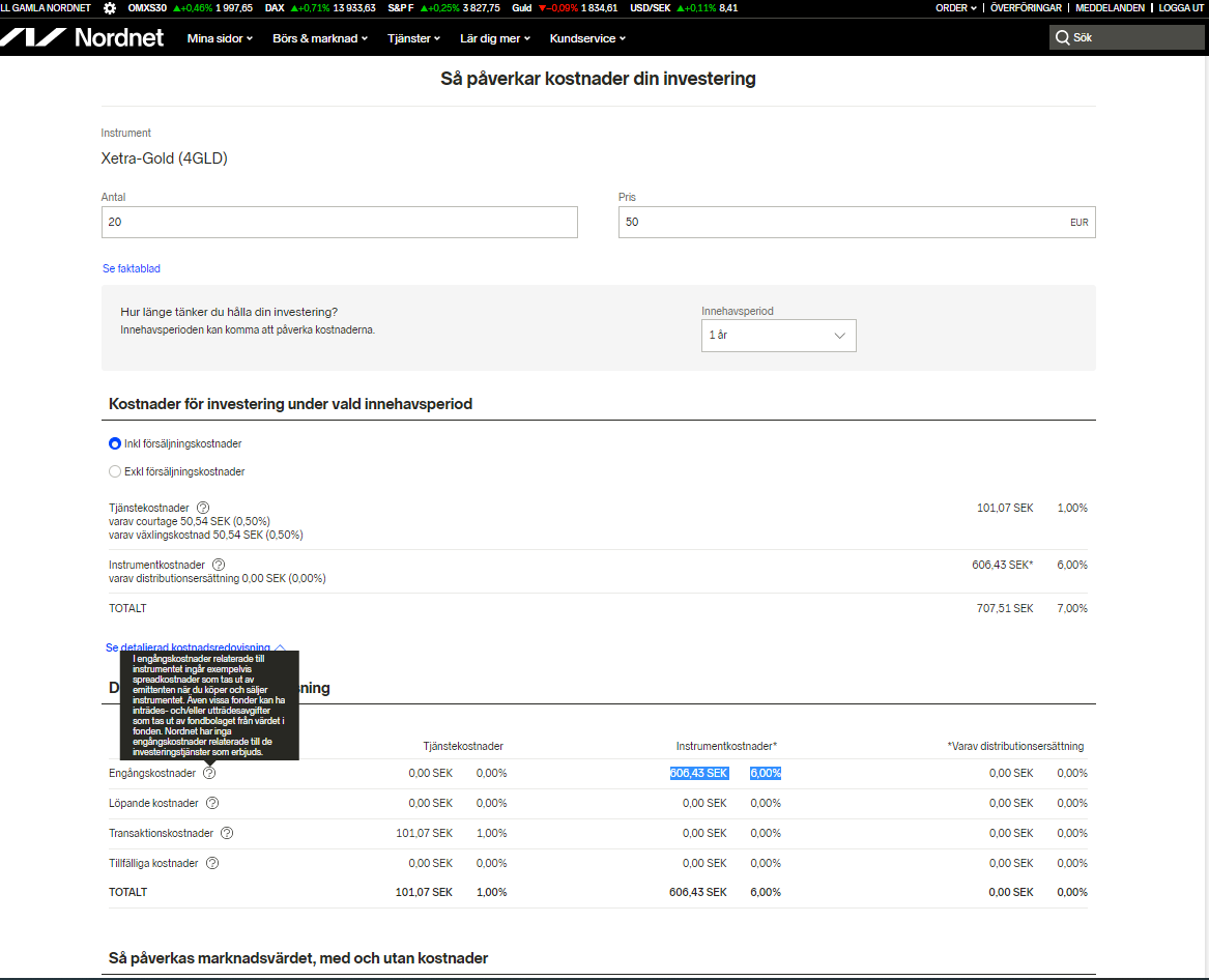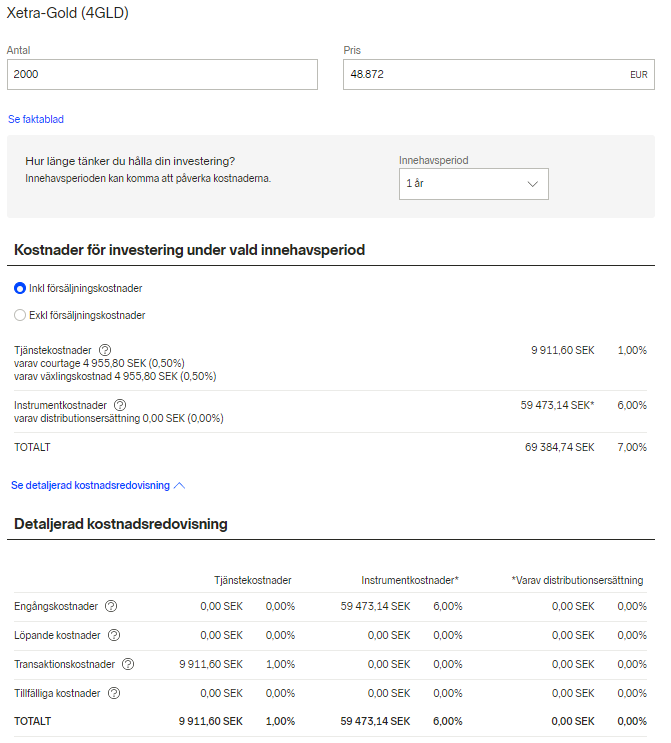 Om du tar en större summa (2000 i antal istället) hur stor % blir kostnaden då? Vad säger informationen om du klickar/hovrar över frågetecknet där det står 6%? Denna kostnad är ny för mig och ser ut att vara en kostnad utöver de andra kostnaderna som jag räknade upp tidigare…