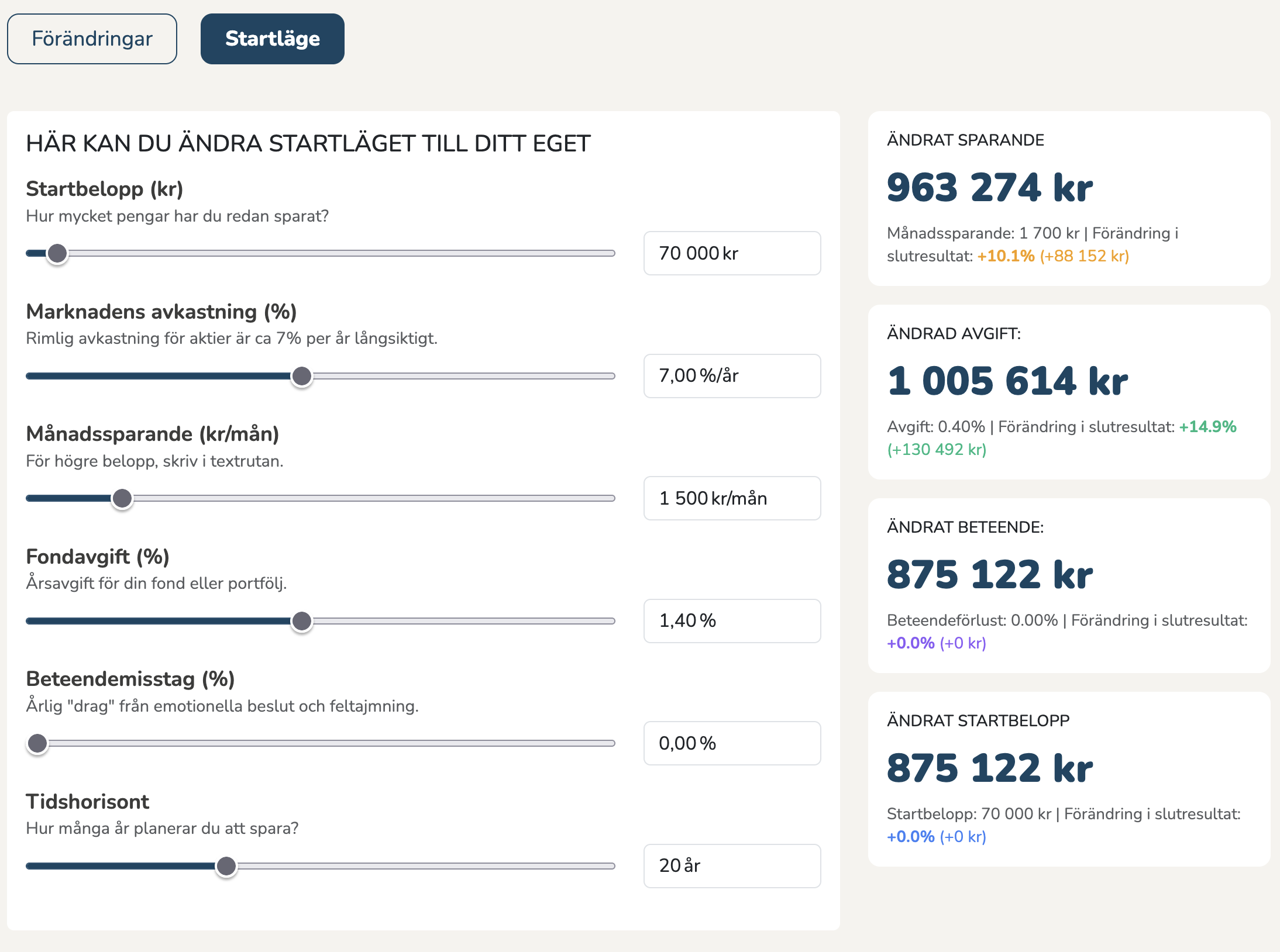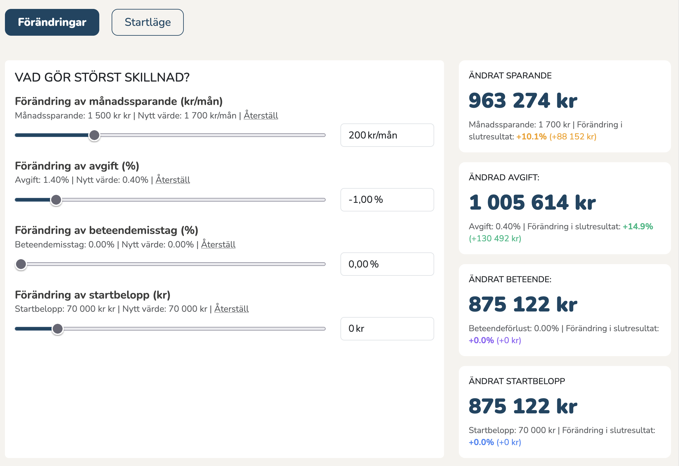 Min upplevelse är att många, undertecknad inkluderad, ibland fokuserar på fel saker i sitt sparande. I denna nya räknaren på hemsidan kan vi en gång för alla prova vad som ger mest effekt. Är det att öka månadssparandet? Att sänka totalavgiften i portföljen? Är det att sluta pilla och undvika beteendemisstag, eller att höja startbeloppet?