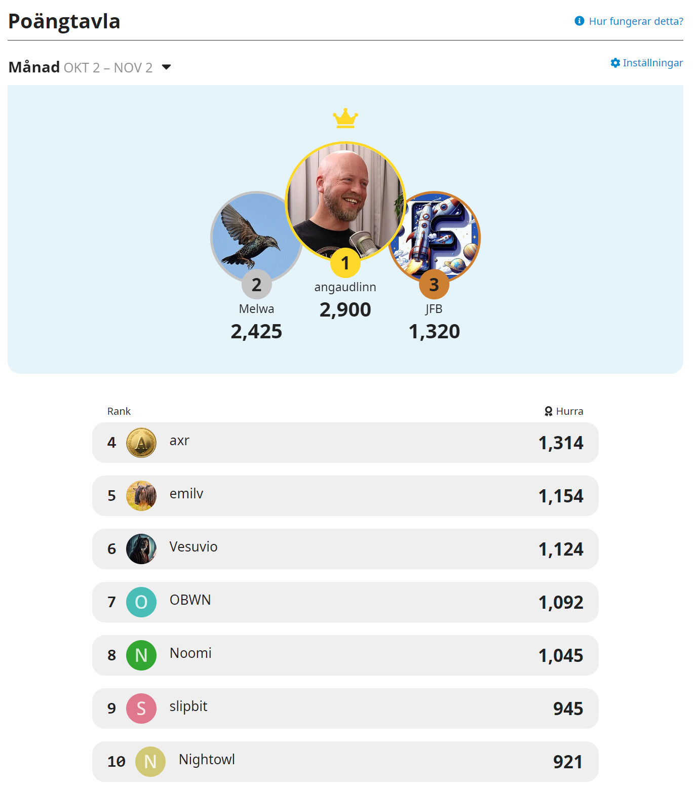 Vi har ju en topplistan utifrån chatten varje månad i denna tråden: “Topplistan i chatten senaste månaden. 🙂” med den högst ärorika titeln och utmärkelsen “chattmästare”. Borde vi inte ha en liknande för den som vinner poängtavlan för månaden?