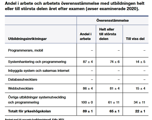 Från Områdesanalysen 2022, taget från data under pandemin, det var lägre än 2017-2019 där 93% fick arbete. Vissa utbildningar hade högre. Strecken är för att det finns för få observationer.