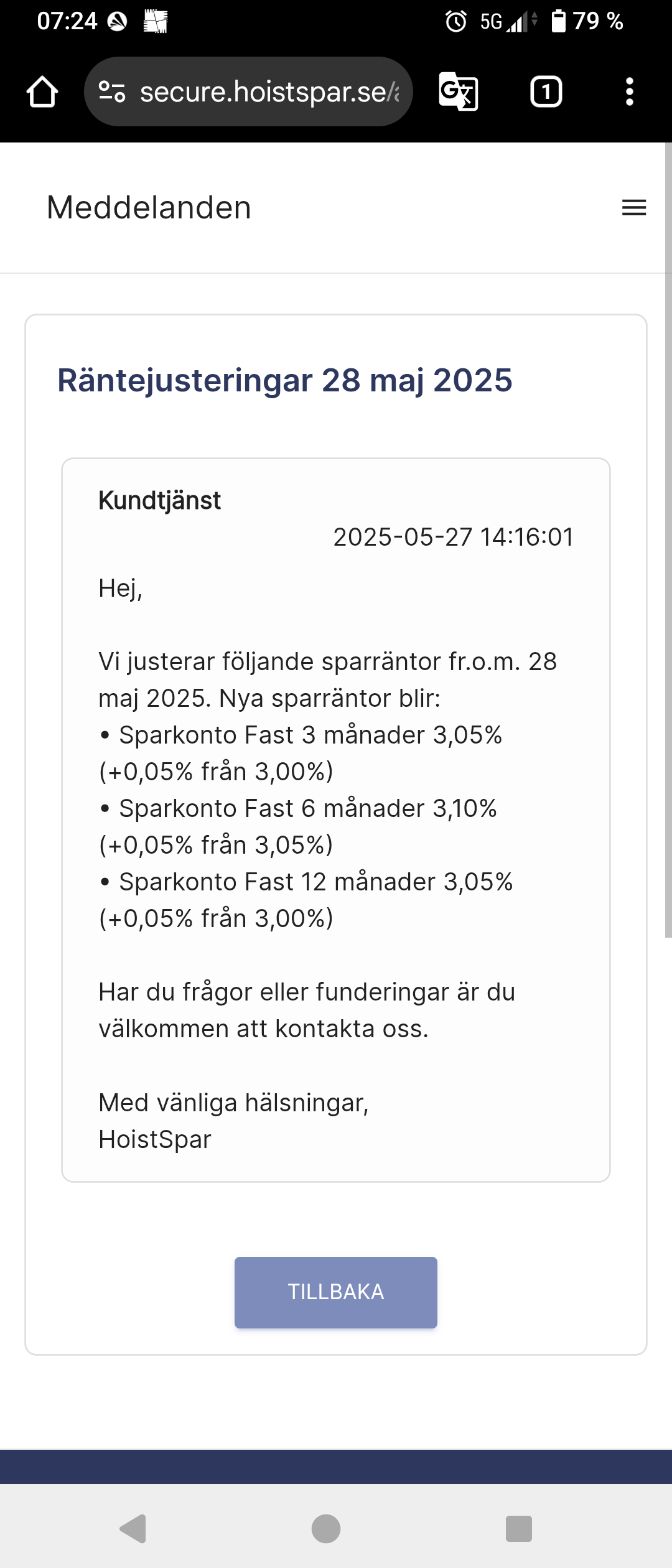 Lite ovanlig lösning för insättning till fast sparkonto hos Hoistspar, men i mina ögon en av de bättre. Speciellt i nedåtgående ränteperioder är det positivt att kunna “låsa in” en specifik räntesats som man sedan kan använda 2 veckor framåt.