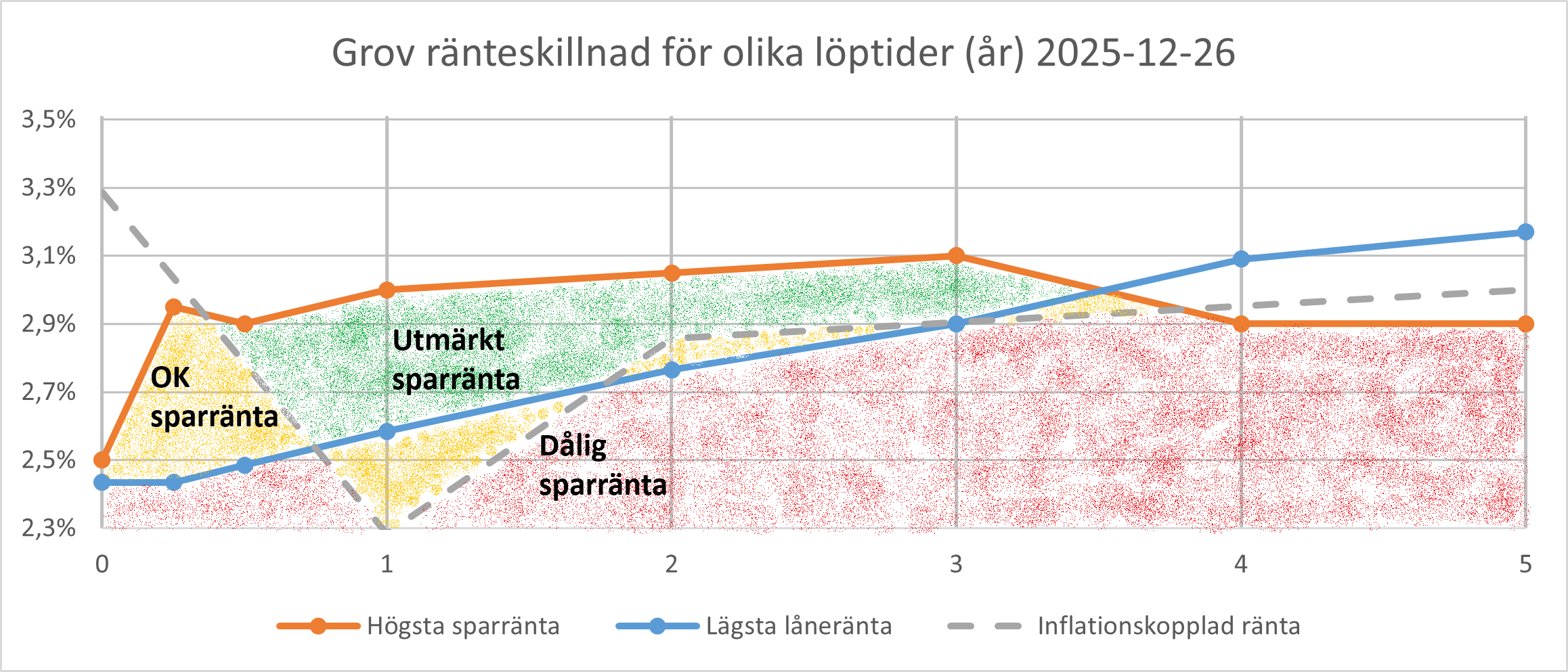 Utmärkta sparräntor (grönt område) återfinns nu för löptider mellan 0,5 och 3 år. Fortsatt finns dessutom OK sparräntor (gula områden), speciellt på löptider upp till 0,5 år.