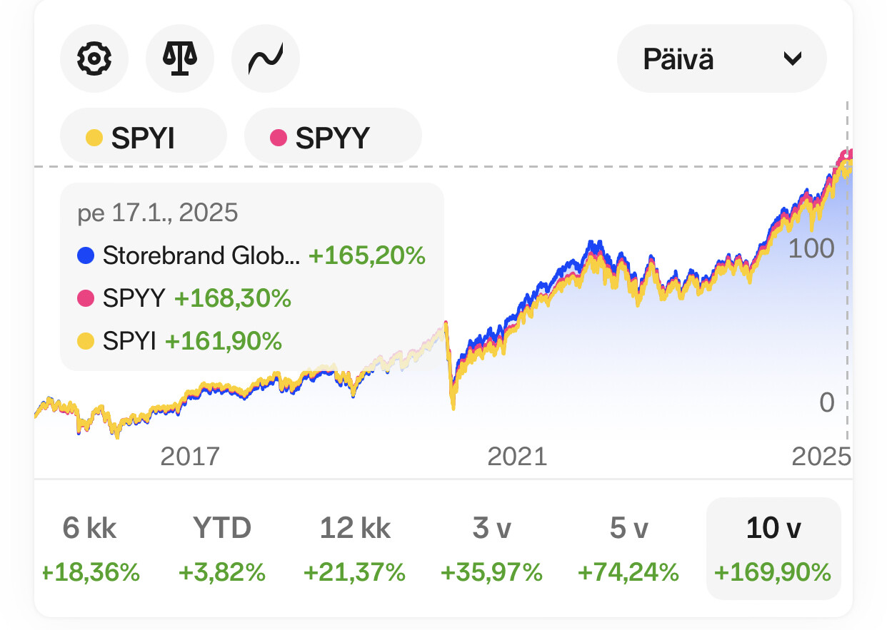 Antar att de följer olika index, men är det någon som lite snabbt vet vad det är som gör att denna etf underpresterar storebrand all countries (orange) senaste 3 åren? Trodde den högre avgiften för storebrand skulle väga tyngre än skillnader i index.