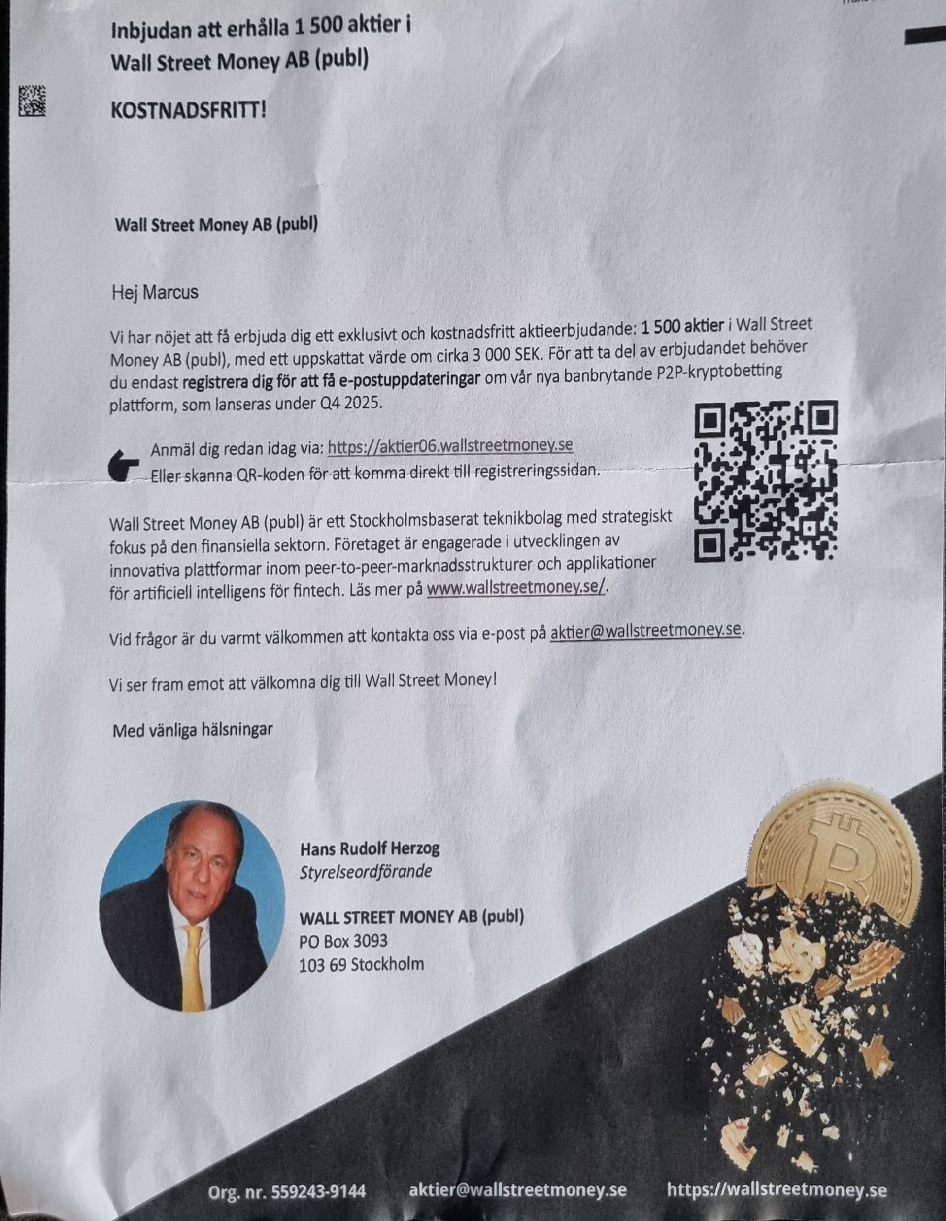 Har fått hem ett brev idag om ett erbjudande om aktier i Wall street money ab. Org nr: 559243-9144