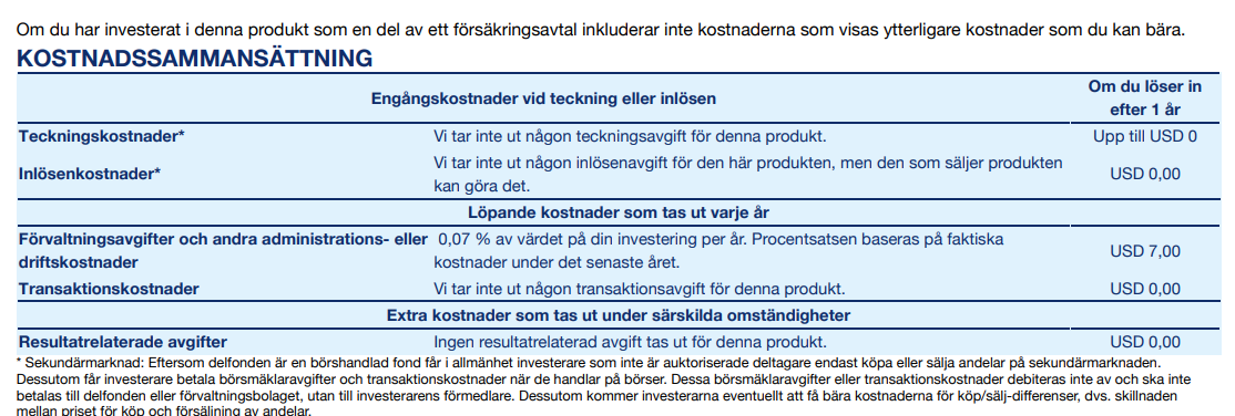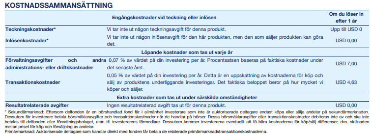 Utöver detta diskuteras också en “Administrative fee” som ska täcka just diverse administrationskostnader, dock inte transaktionskostnader (för långt att citera exakt vad som ingår). På sidan 122 syns att Management Fee är 0,03% och Administration Fee är 0,04%, summa 0,07%.