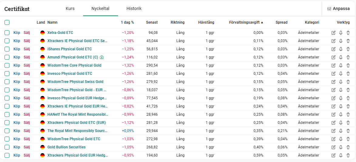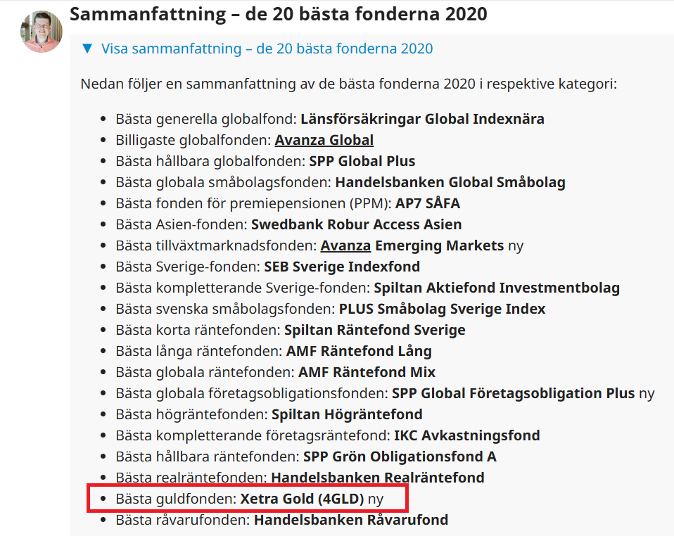 Tack, jag hade inte fått upp den posten i mina sökresultat! 0,025% är ju ändå mindre än 0,11%, vilket gäller för den av de övriga certifikaten som har lägst förvaltningsavgift. Jag noterade senare dessutom att Jan rekommenderat Xetra-Gold i en post från 2020. Då borde den ju vara kvalitetssäkrad, tänker jag.