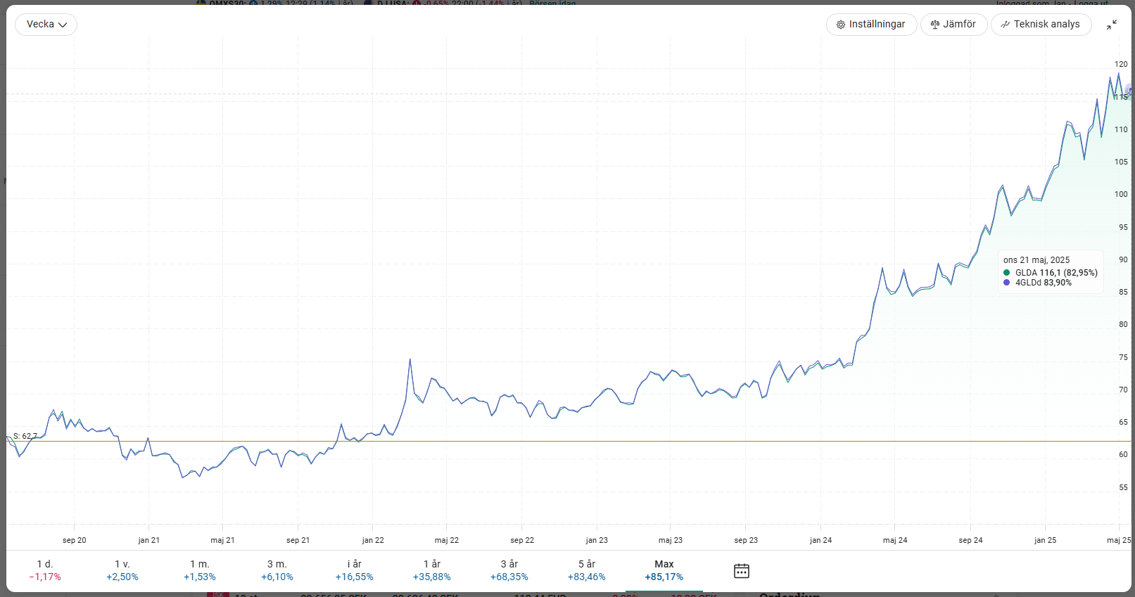 Fast jämför jag den med t.ex. Amundi Physical Gold ETC (GLDA) på längsta tidsspannet i Avanza så är det ju ingen större skillnad. Xetra-Gold presterar t.o.m. några tiondels %-enheter bättre under drygt 5 år.