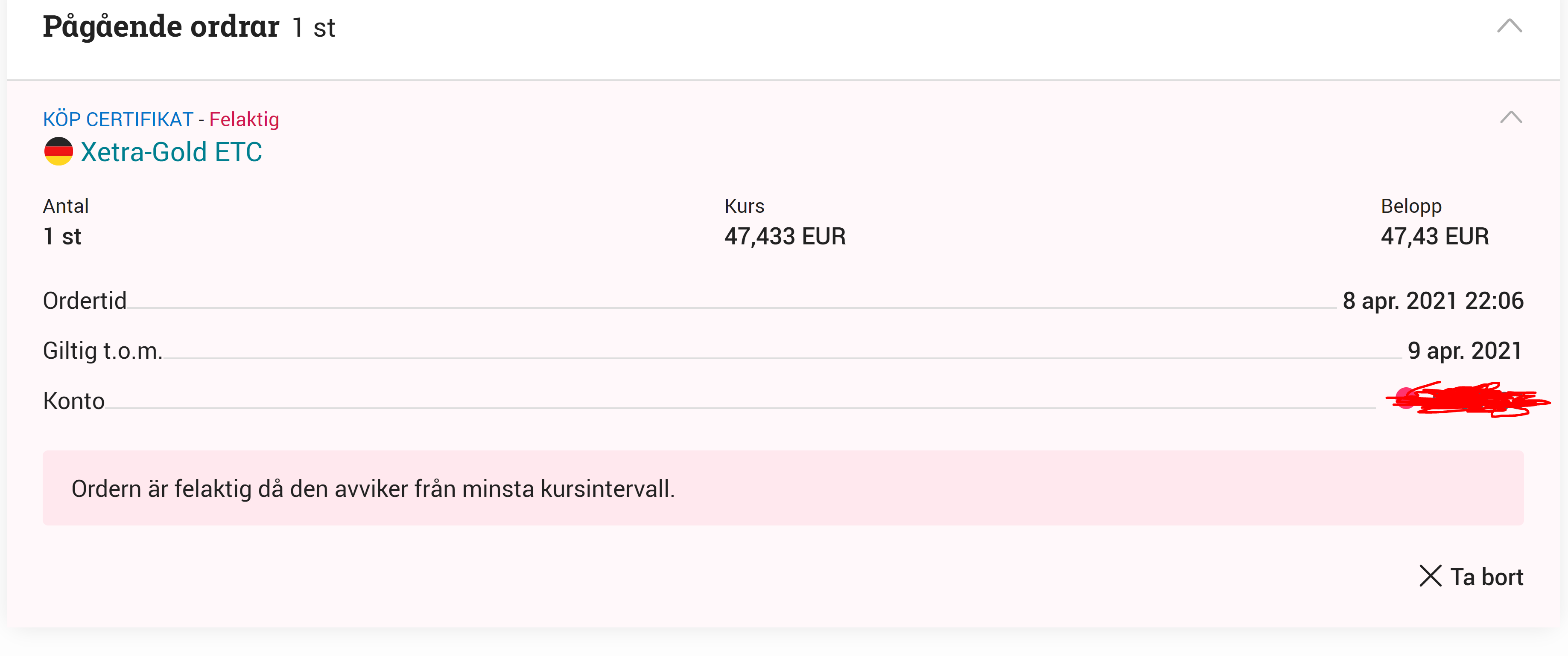 Hej! Försöker köpa i Xetra Gold men får svaret att det inte går att lägga ordern fdå den “avviker från minsta kursintervall”. Vad är det för fel på min order då?